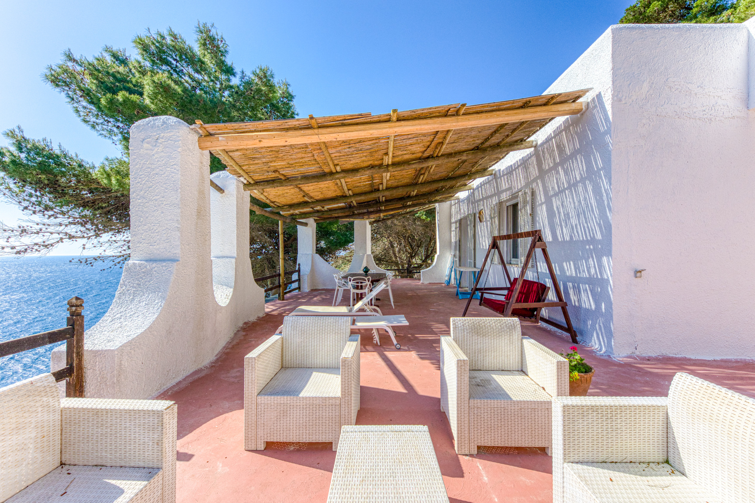 Das Anwesen besteht aus sieben weit auseinander liegenden und durch Pinien getrennten Häusern (siehe Plan in der Fotogalerie); dieses Haus liegt dabei am unteren, zum Meer hin ausgerichteten Rand des Anwesens und verfügt dadurch über viel Privatsphäre. Zwischen den Siebzigern und den Neunzigern war dies ein Rückzugsort für italienische VIPs. In den letzen Jahren nach und nach teilrenoviert, ist dieses traumhafte Fleckchen Erde nun wieder für Menschen zugänglich, die Erholung und Ruhe in der Natur suchen. Der Blick über die unterschiedlichen Blautöne von Meer und Himmel lässt die Seele baumeln.