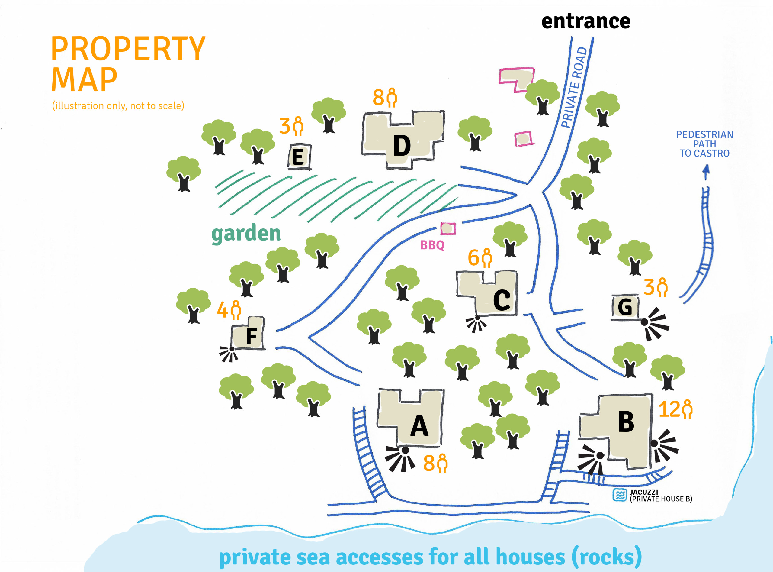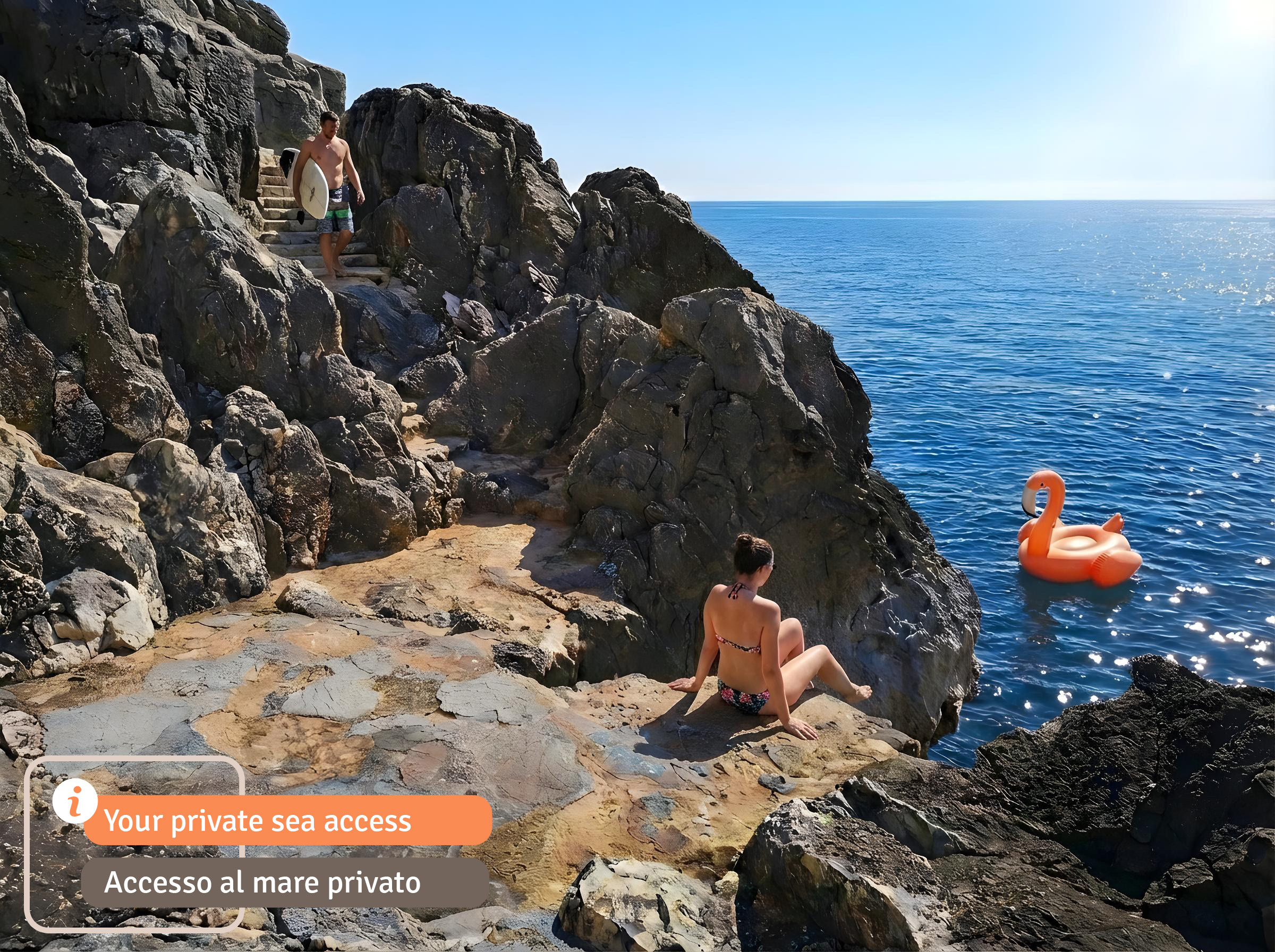 Direkt unter dem Haus führt ein Privatweg an einigen Panorama-Picknickplätzen vorbei die Steilküste hinunter ans Meer (Wegzeit ca. drei Minuten, ca. 50 Meter Höhenunterschied); es gibt vier Zugänge zum Wasser, wo Sie schwimmen, schnorcheln, angeln oder tauchen können. Oder auch einfach nur die Delfine begrüßen, die hier insbesondere in der Nebensaison oft vorbeischauen. (Vorsicht: Der Zugang zum Meer erfolgt auf eigene Gefahr, der Weg ist steil und es gibt viele Stufen. Nicht für kleine Kinder oder Geheingeschränkte geeignet!)