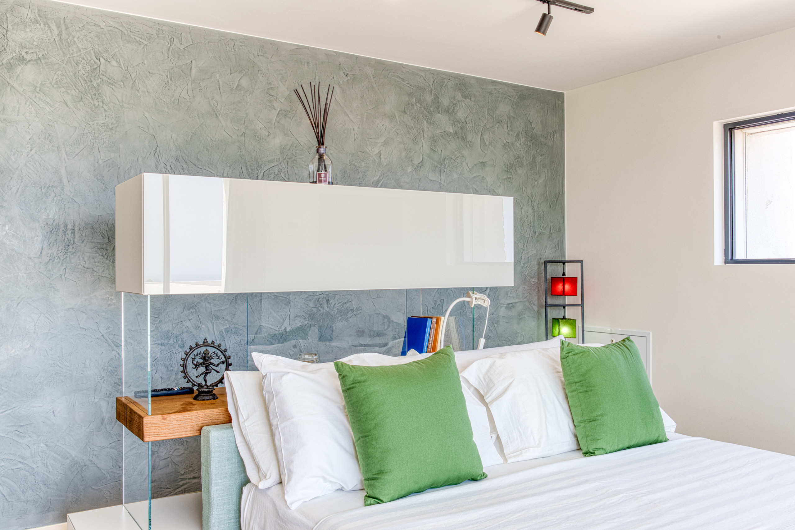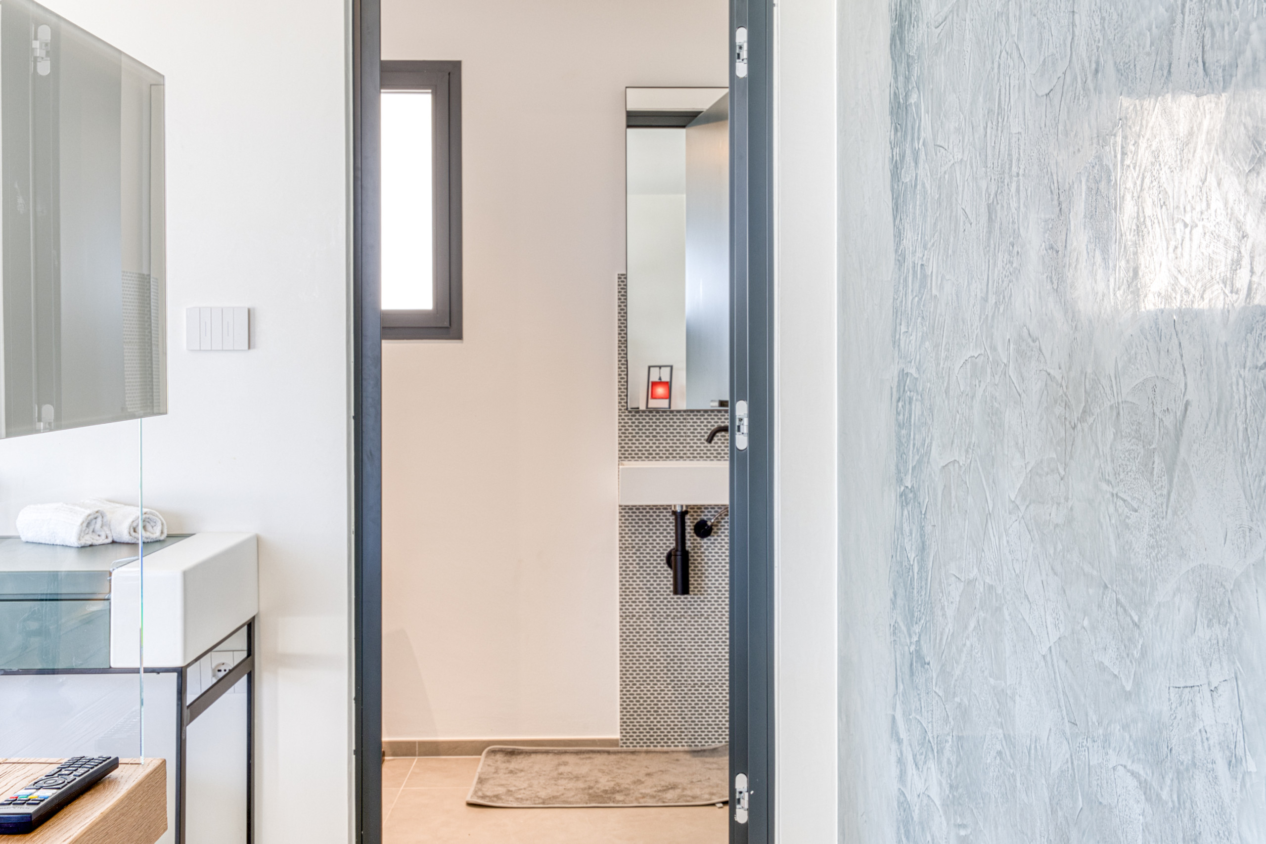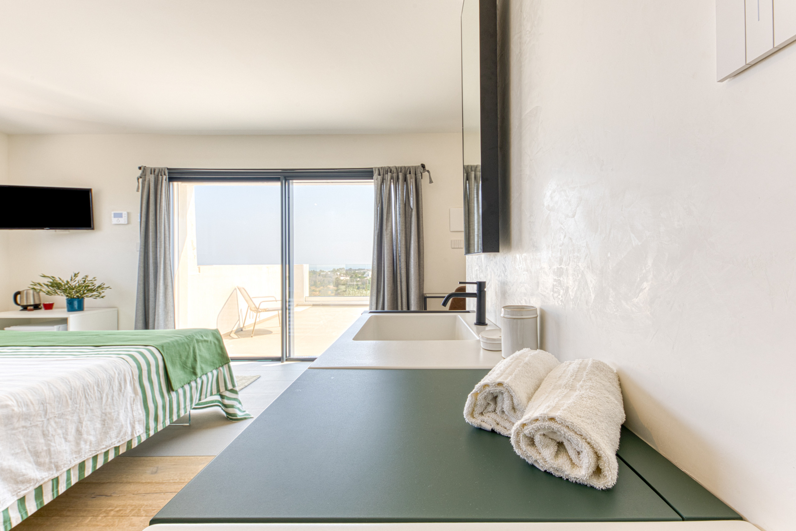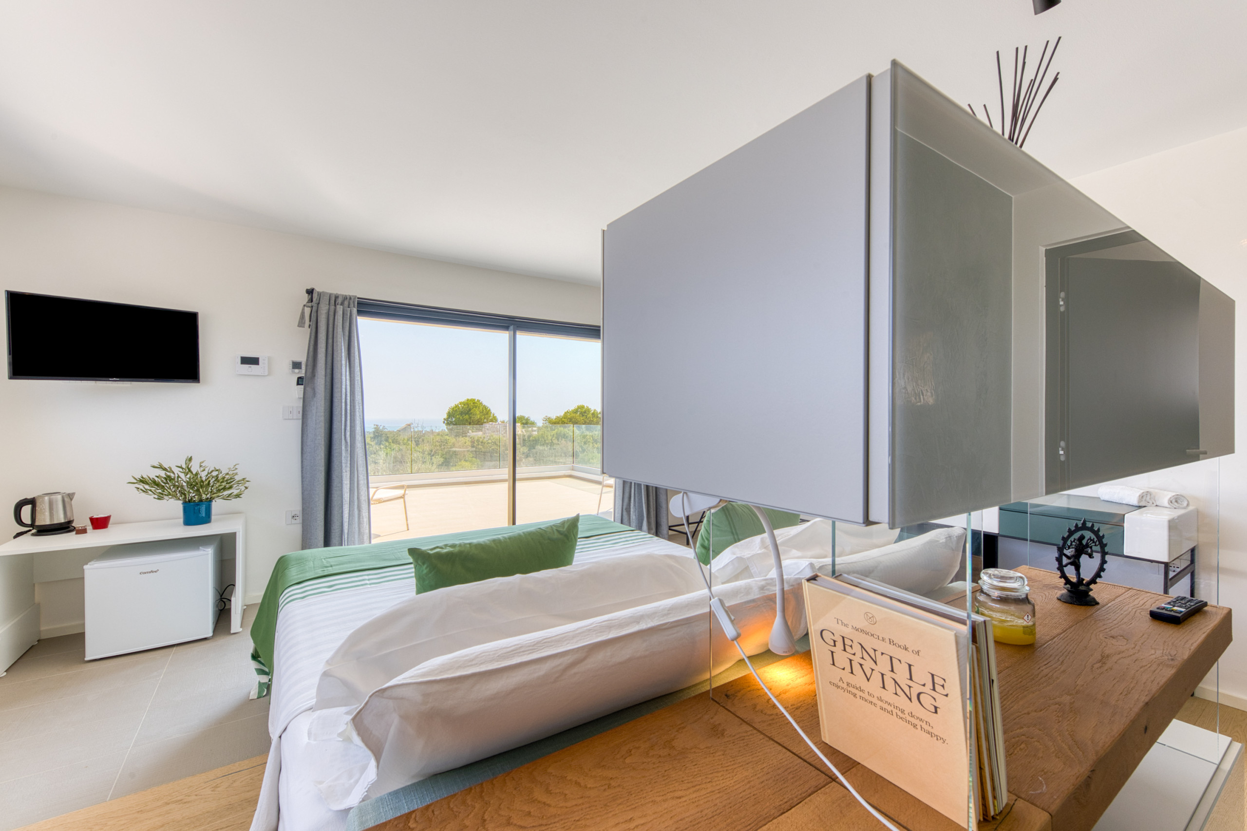 Das Obergeschoss beherbergt eine luxuriöse Suite mit Doppelbett und traumhaftem Meerblick, eigenem Badezimmer mit Dusche und einer großen privaten Terrasse, auf der Sie die atemberaubende Aussicht und die ruhige Atmosphäre genießen können.