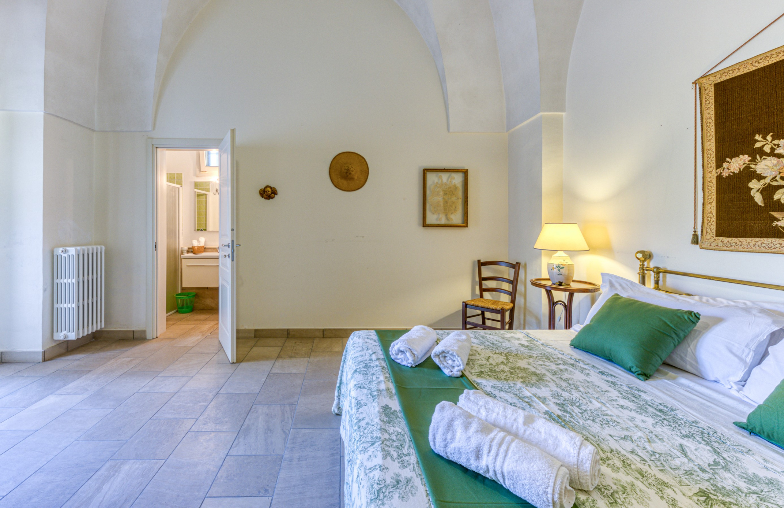 The villa is very spacious and has a large living and dining area with sofas and a dining table and chairs, a well-equipped kitchen, two spacious bedrooms each with their own bathroom with shower, as well as an additional shower room and a laundry room with washing machine. The kitchen has a gas stove, oven, dishwasher, fridge with freezer, toaster, kettle as well as cooking utensils and everything you need for cooking. The high, vaulted ceilings in the Salento style and the partly antique furniture give the house an aristocratic touch. The house is air-conditioned (in the living room, and there are additional fans in the bedrooms), has mosquito nets and is almost completely surrounded by a covered terrace, which is partly overgrown with climbing jasmine, which provides pleasant shade in the hot summer midday hours.
