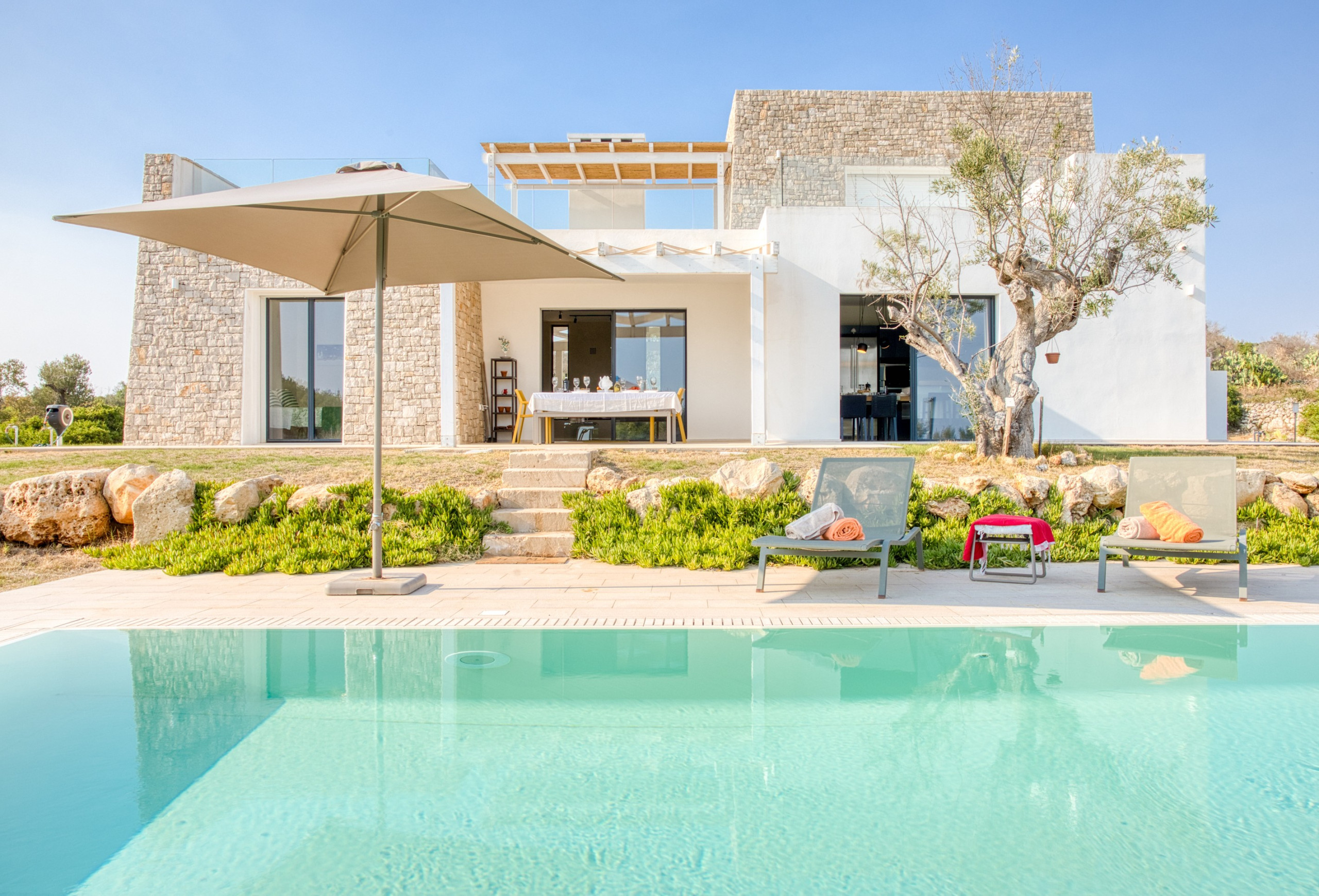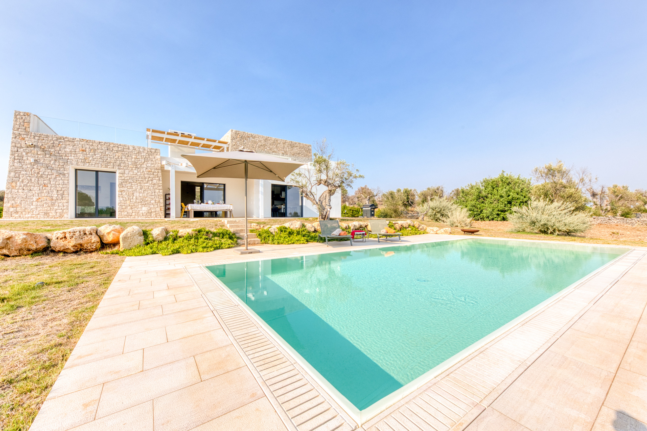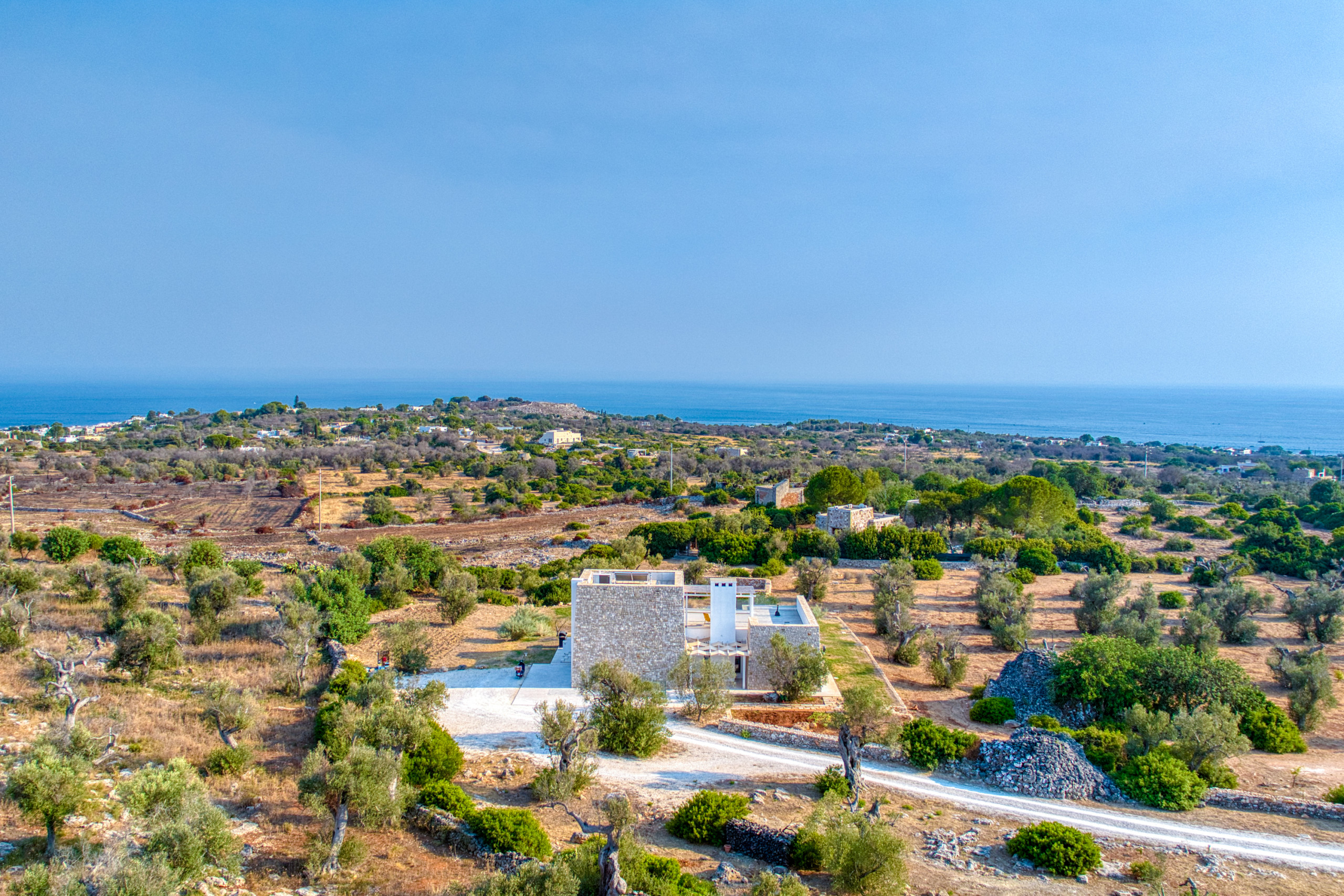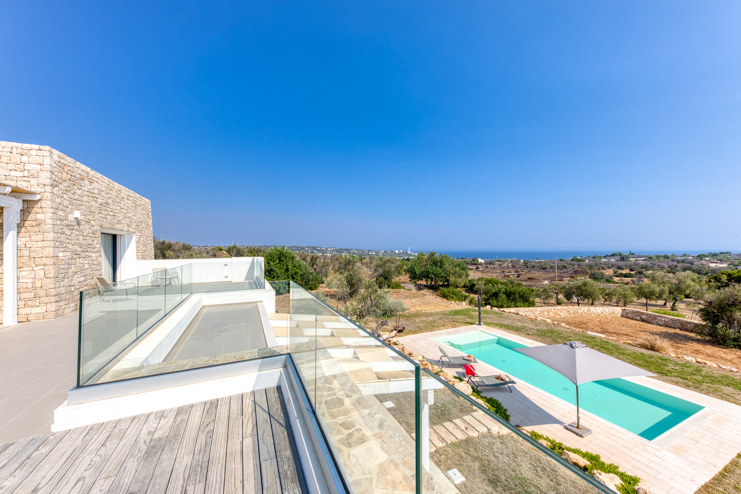 Surrounded by a private 10,000 sqm garden with centuries-old olive trees and lush Mediterranean plants, this exceptional three-level luxury villa - one of the highlights of our collection - offers full privacy and the perfect blend of modern comfort and natural beauty. From every corner, you can admire the fantastic panoramic views that stretch over the landscape, down to the blue sea and to the famous Santa Maria di Leuca lighthouse at the horizon - the place where the Adriatic and the Ionian seas meet.
