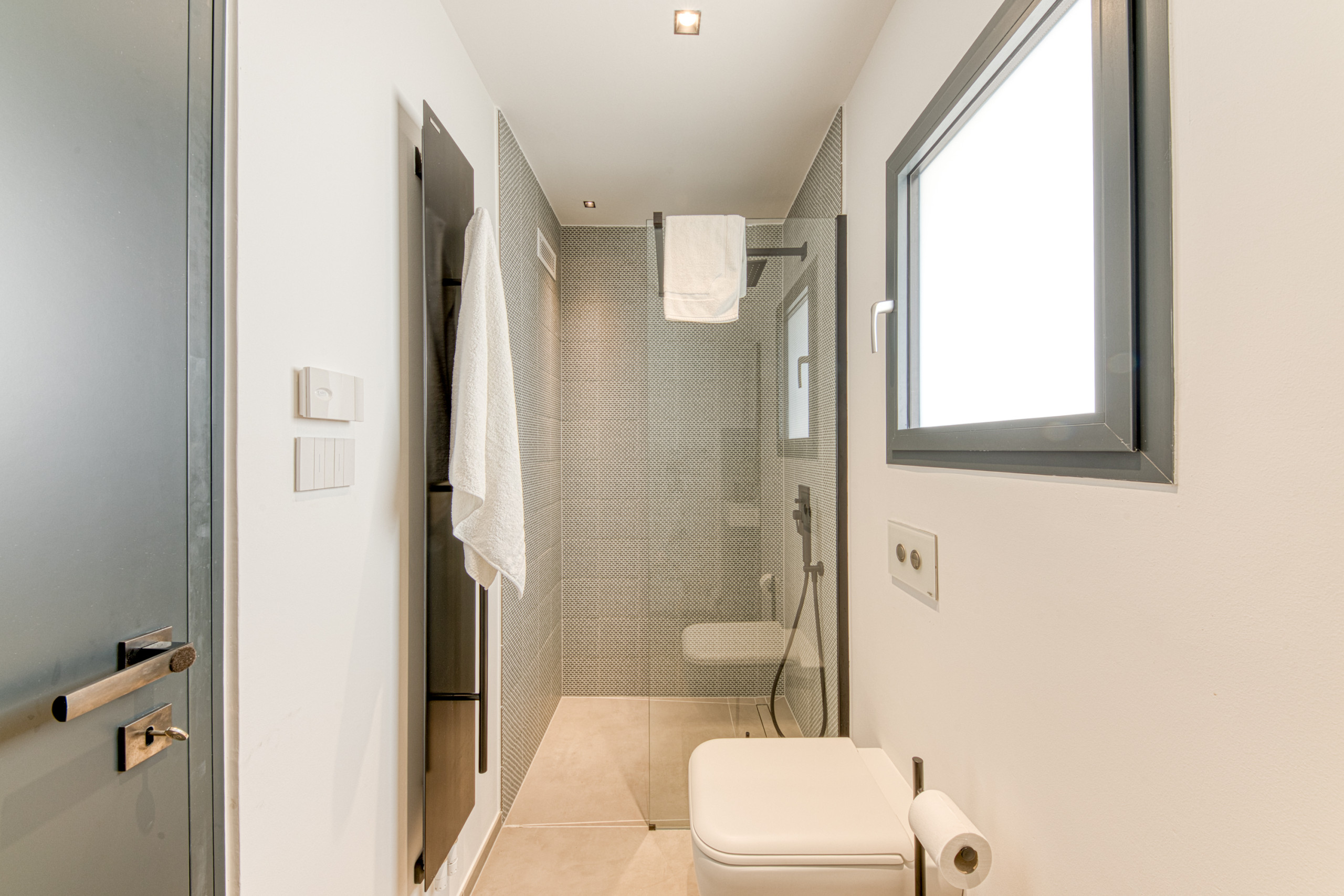 On the ground floor, you’ll find a bright and spacious living area featuring a stunning, fully equipped design kitchen with induction hob, oven, microwave, dishwasher, toaster, kettle, kitchen utensils etc. and comfortable lounge space — ideal for gathering with family and friends. This level also includes two double bedrooms, one of which enjoys a beautiful sea view, along with two stylish bathrooms with showers.