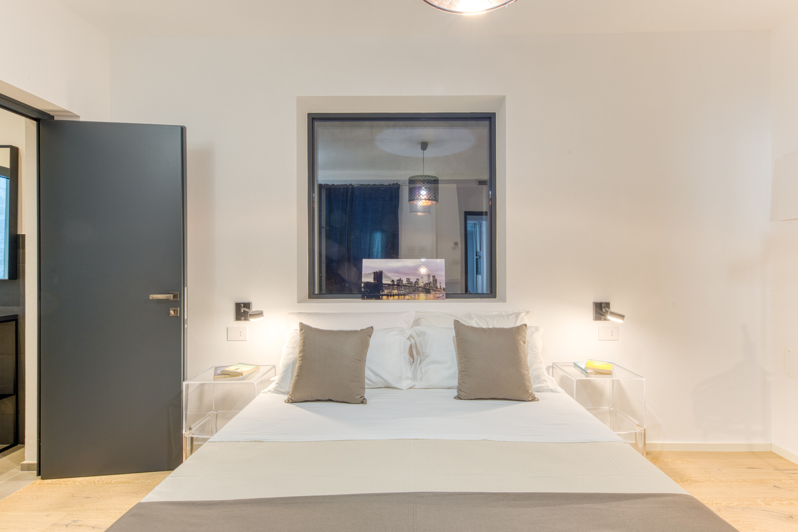 The upper floor is dedicated to a luxurious suite with a double bed and wonderful sea view, en-suite bathroom with shower, and a large private terrace where you can soak in the breathtaking views and the tranquil atmosphere.