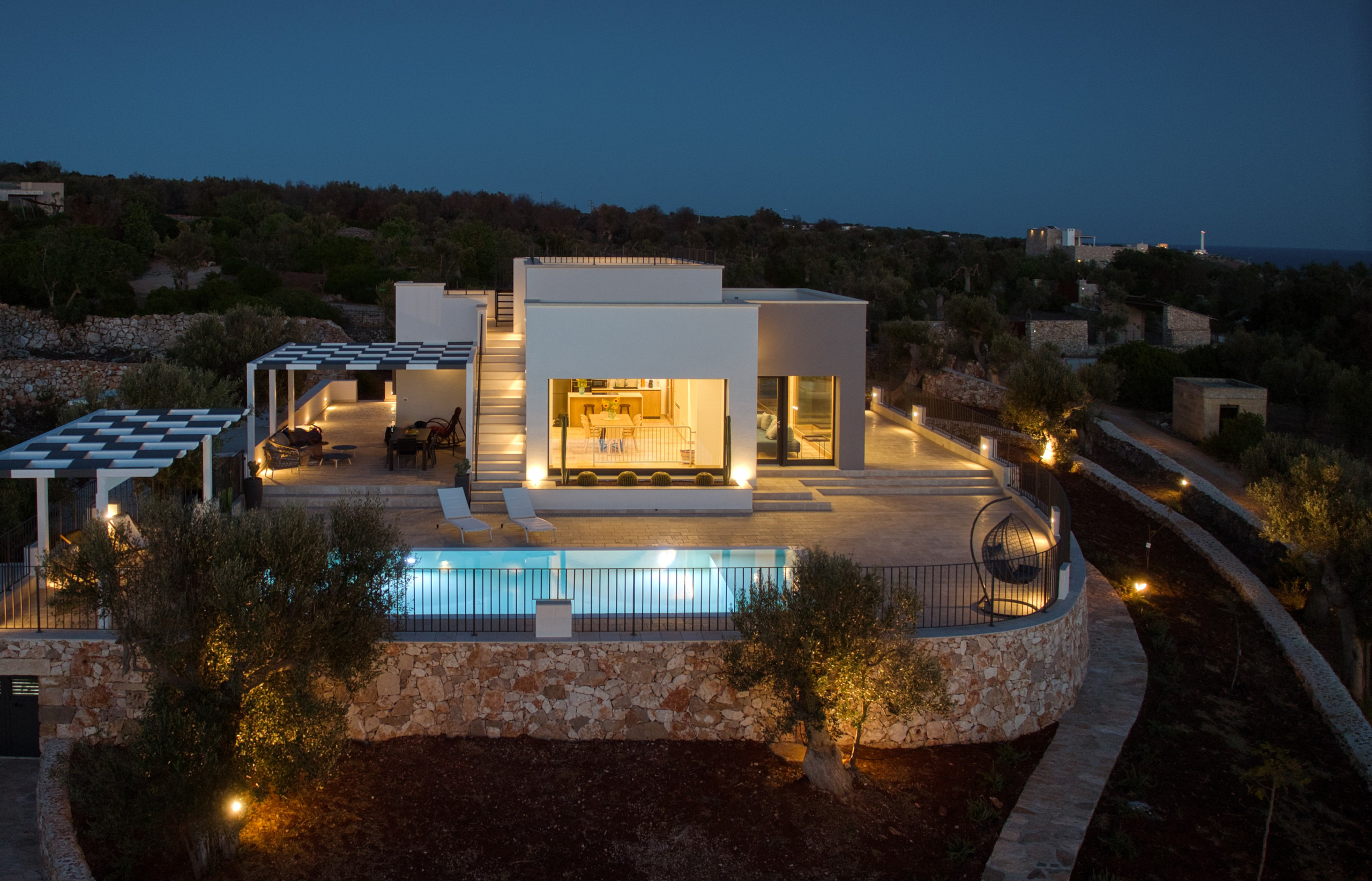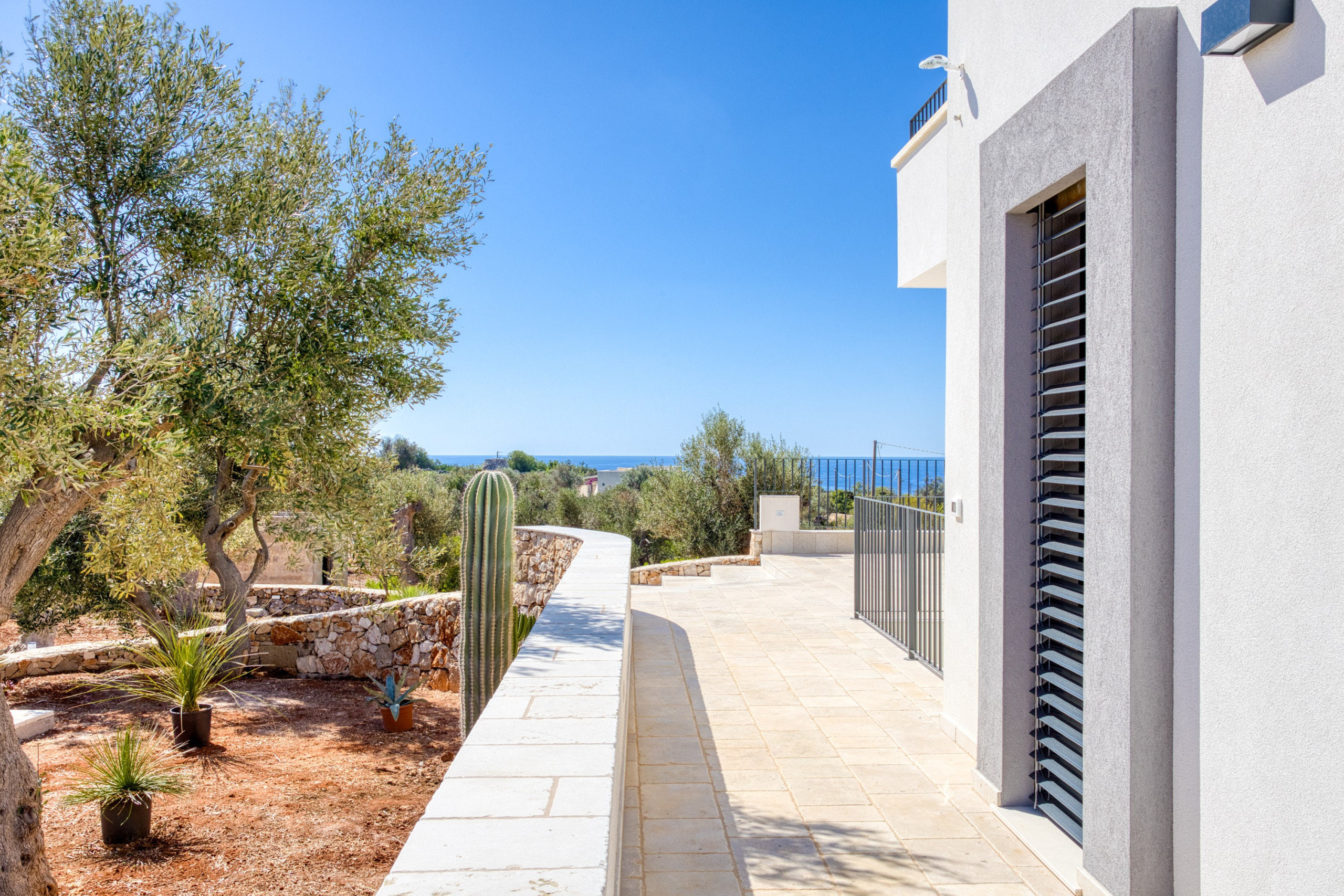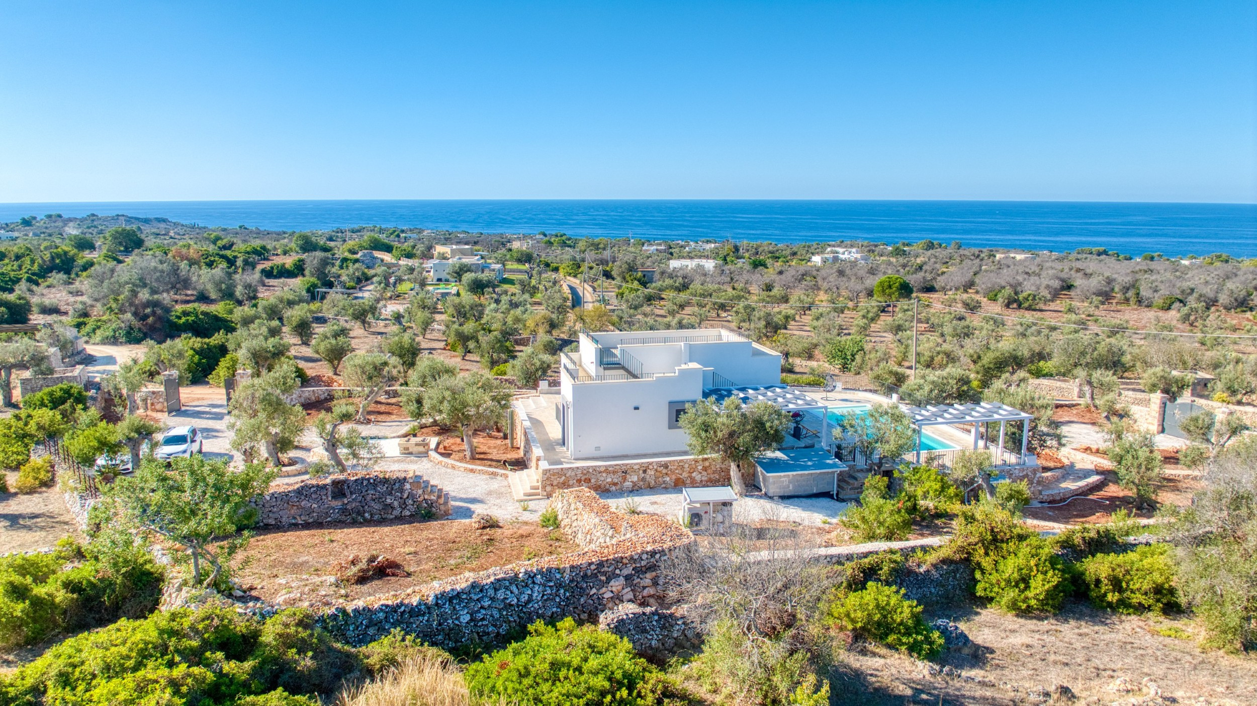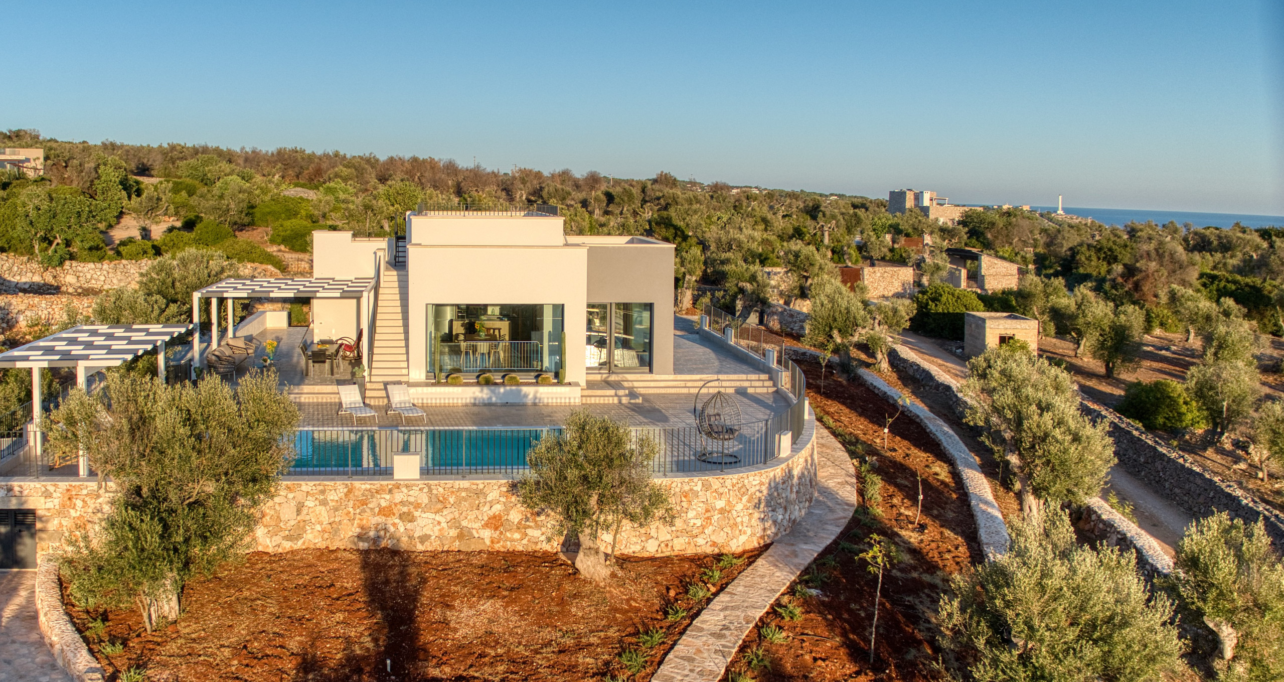Framed by the rolling hills of Capo di Leuca, covered in olive trees and Mediterranean macchia, this ultra-modern villa, one of the most luxurious in the area, is the exclusive retreat you've been searching for. Just completed in September 2025, it offers a spectacular view spanning the enchanting Ionian Sea with its infinite shades of blue and the surrounding verdant countryside. In the distance, the imposing lighthouse of Santa Maria di Leuca, symbolizing the meeting of the Ionian and Adriatic Seas, stands out on the horizon, offering a breathtaking panorama.