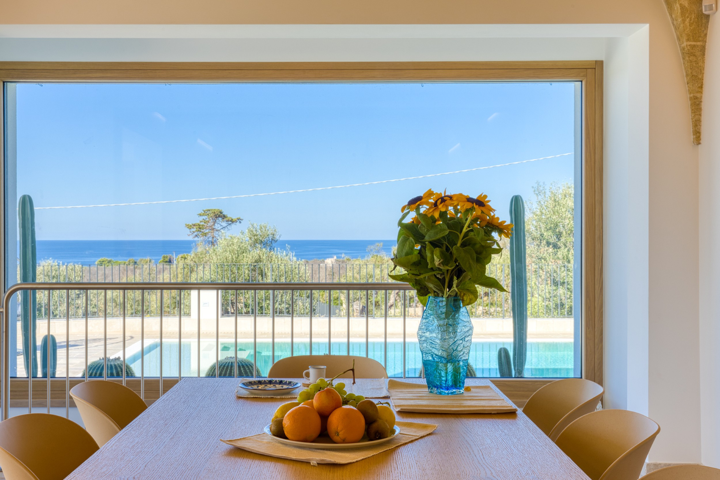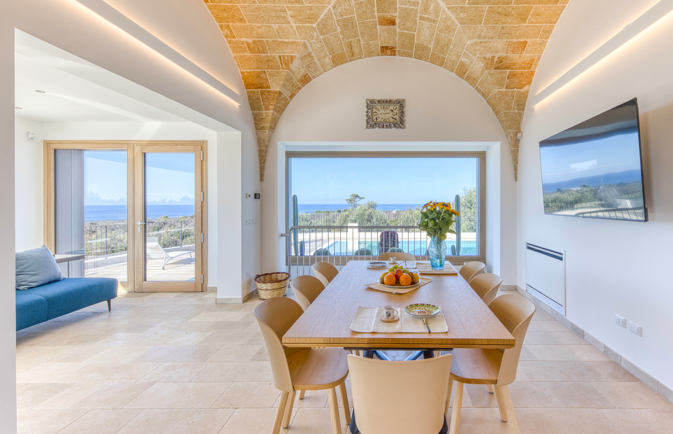 Outside, the private pool, measuring approximately 10x4 meters, is a corner of paradise with a spectacular view that extends to the horizon. The pool can be heated upon request (for a supplement of €10 per day + €100 for preparation), allowing for use almost year-round. The spacious outdoor terraces are perfect for relaxing under the sun or in the shade. An outdoor shower and barbecue are ready to make your evenings even more special, with the option of dining al fresco, sipping a fine Salento wine and enjoying the serenity that only a place like this can offer.