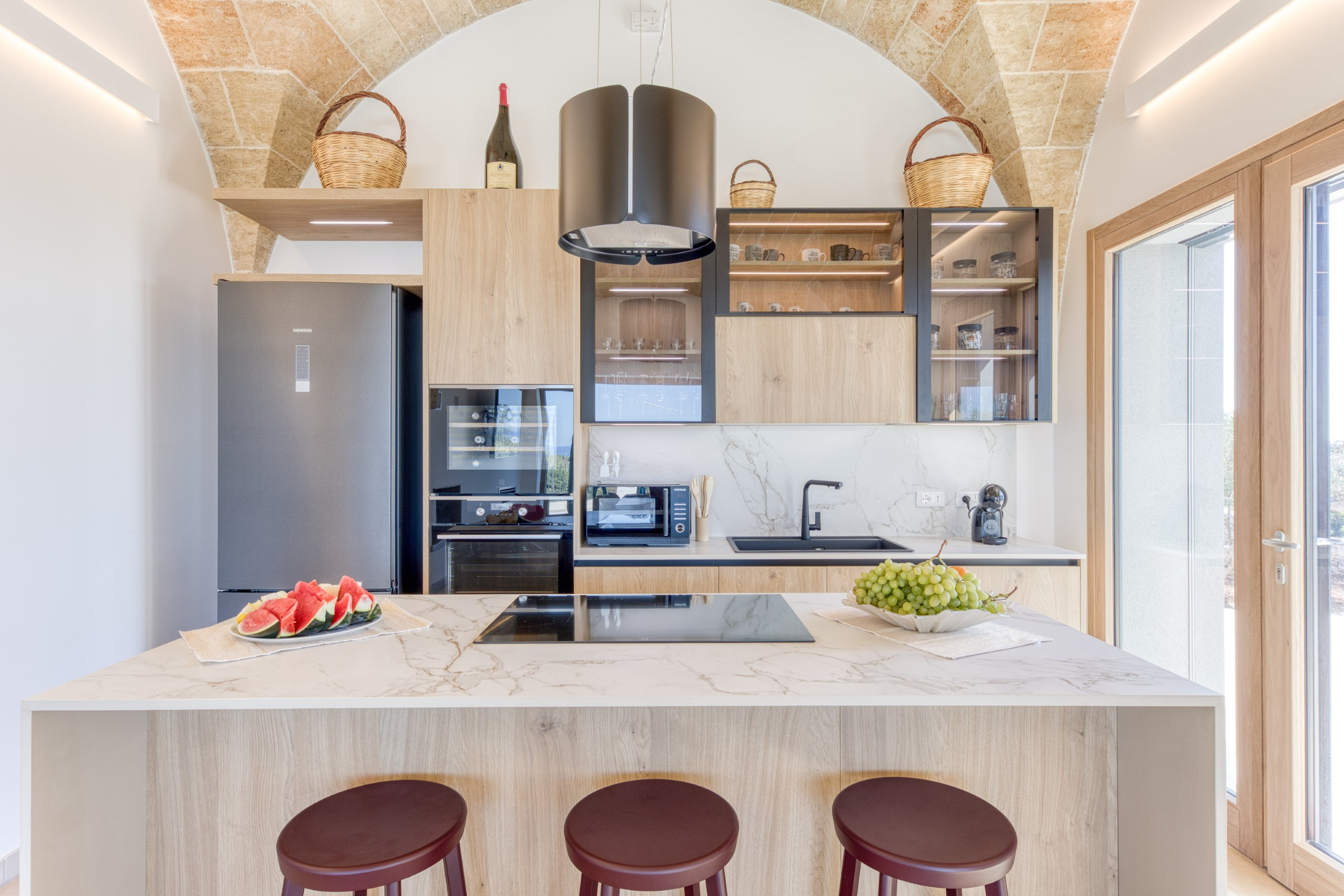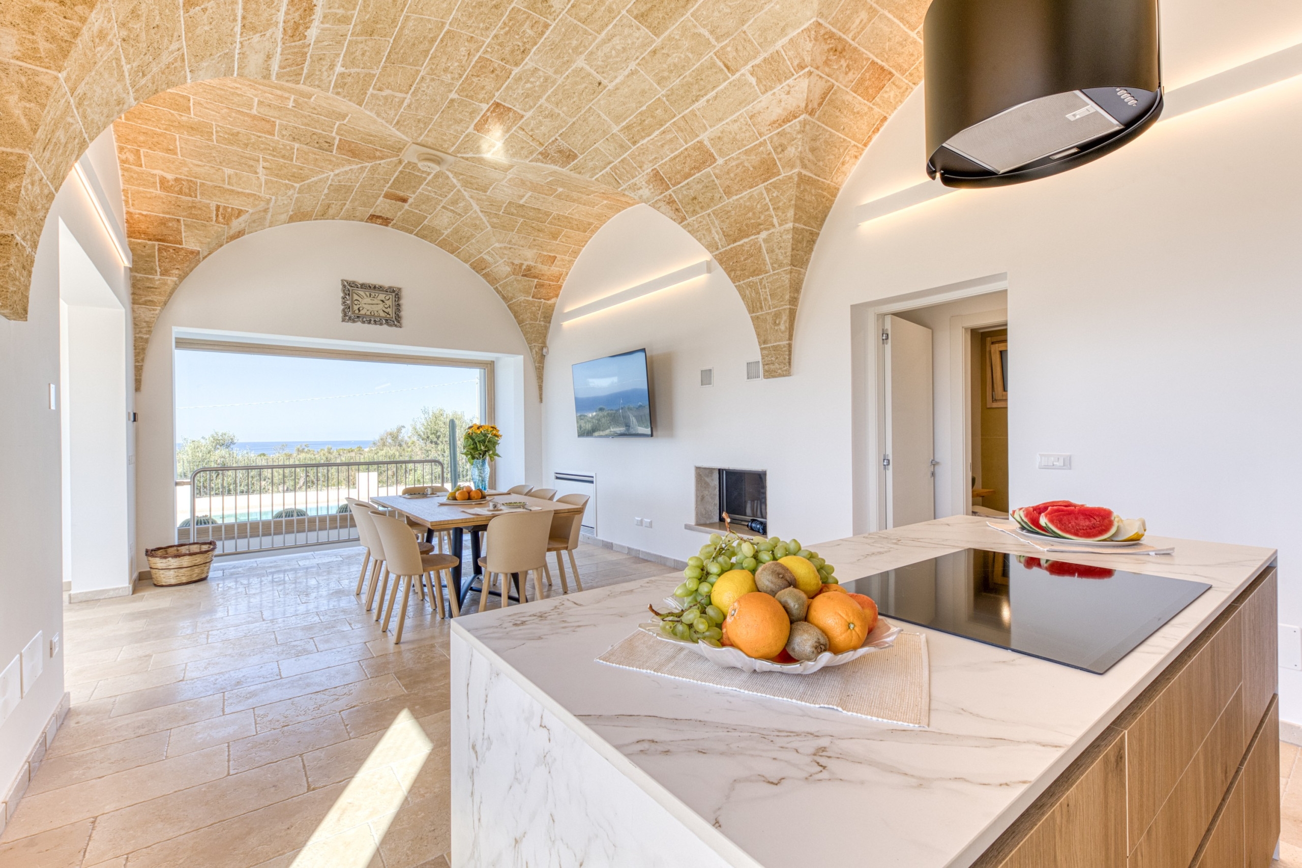 The villa features a fully equipped kitchen, ideal for lovers of good food. Induction hob, oven, microwave, dishwasher, toaster, kettle, and coffee maker: every detail is designed for practicality and functionality without sacrificing style.