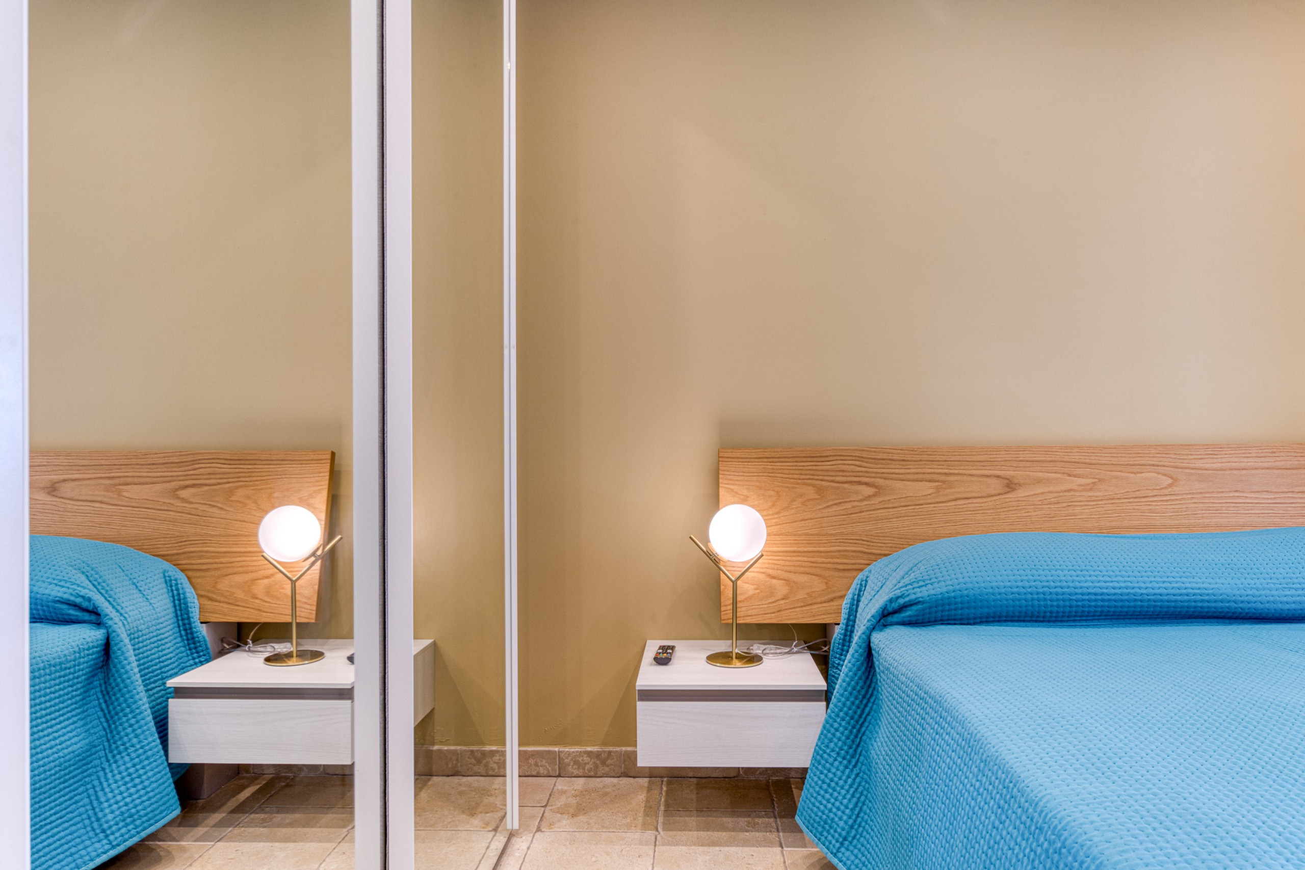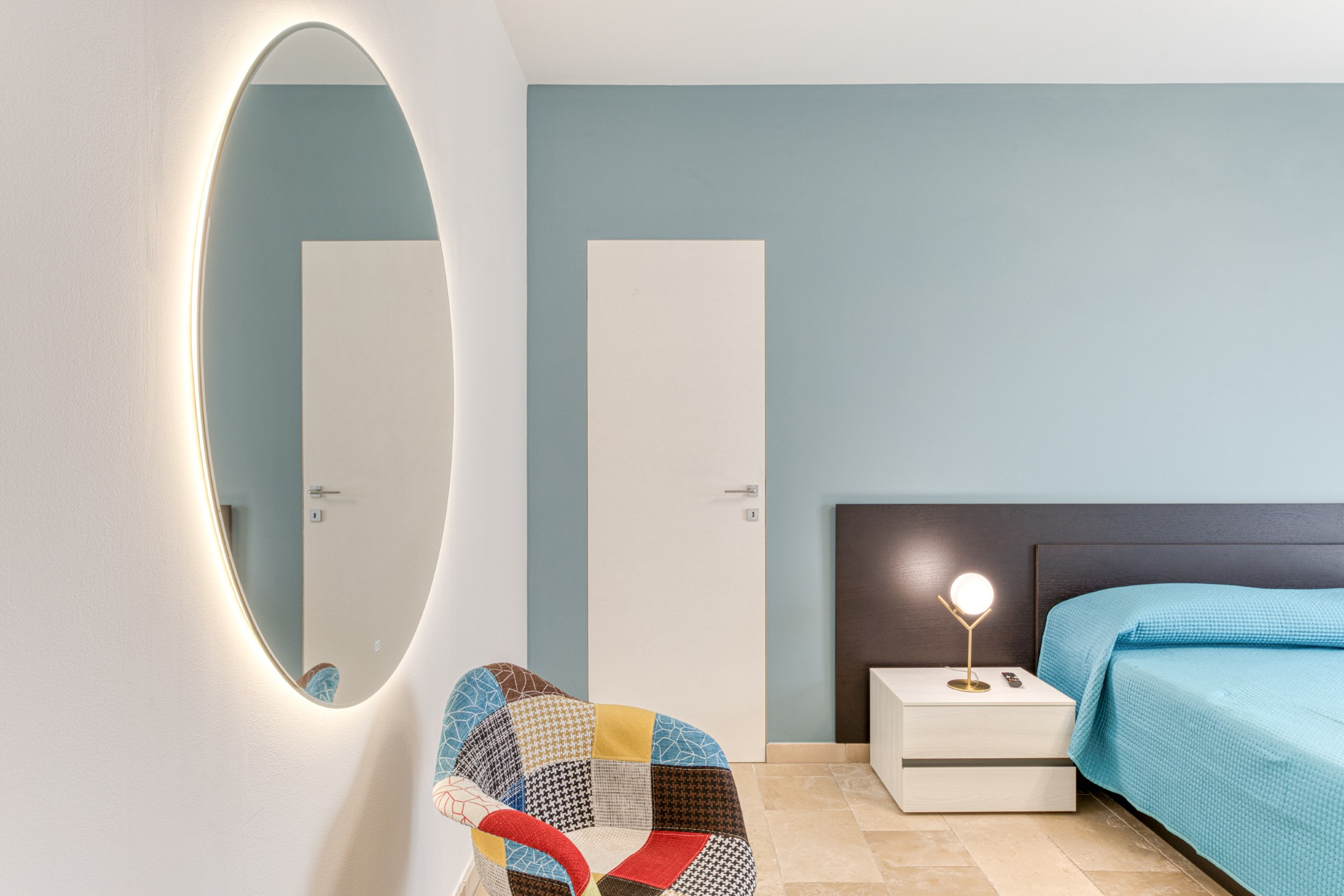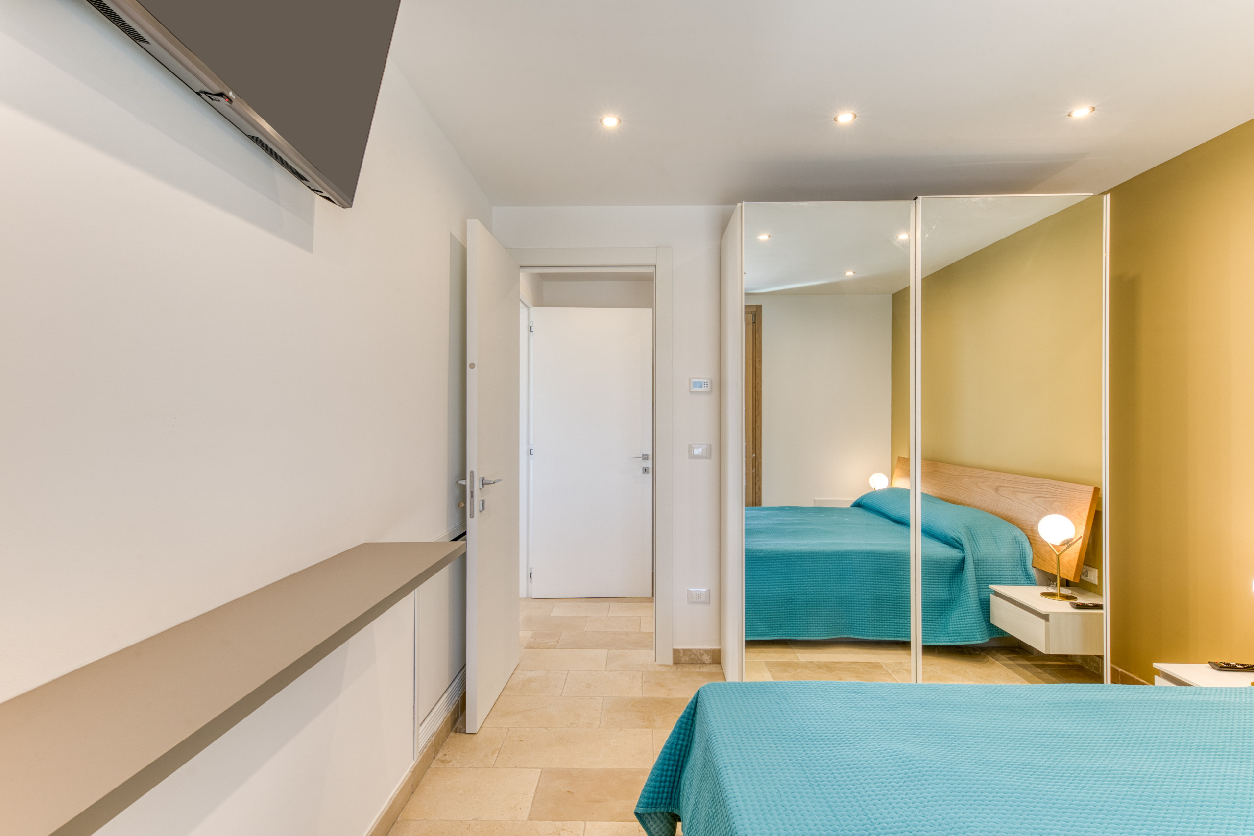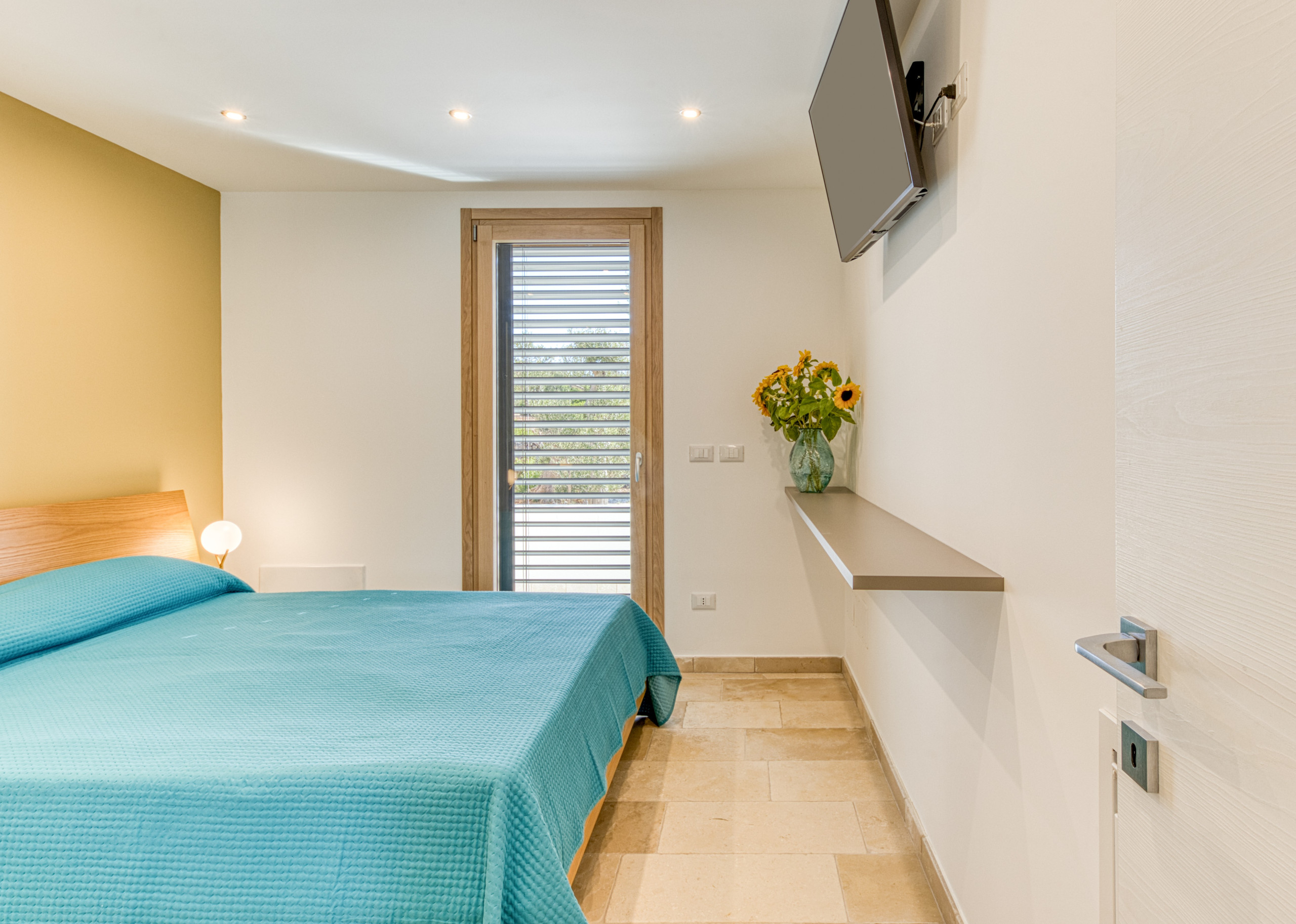 The minimalist and colorful design blends harmoniously with traditional Salento architectural elements, such as the splendid tuff star vaults, creating a refined yet welcoming atmosphere. Each room is equipped with individually controlled air conditioning, ensuring maximum comfort at any time of the day. For total relaxation, four satellite TVs are available to guests.