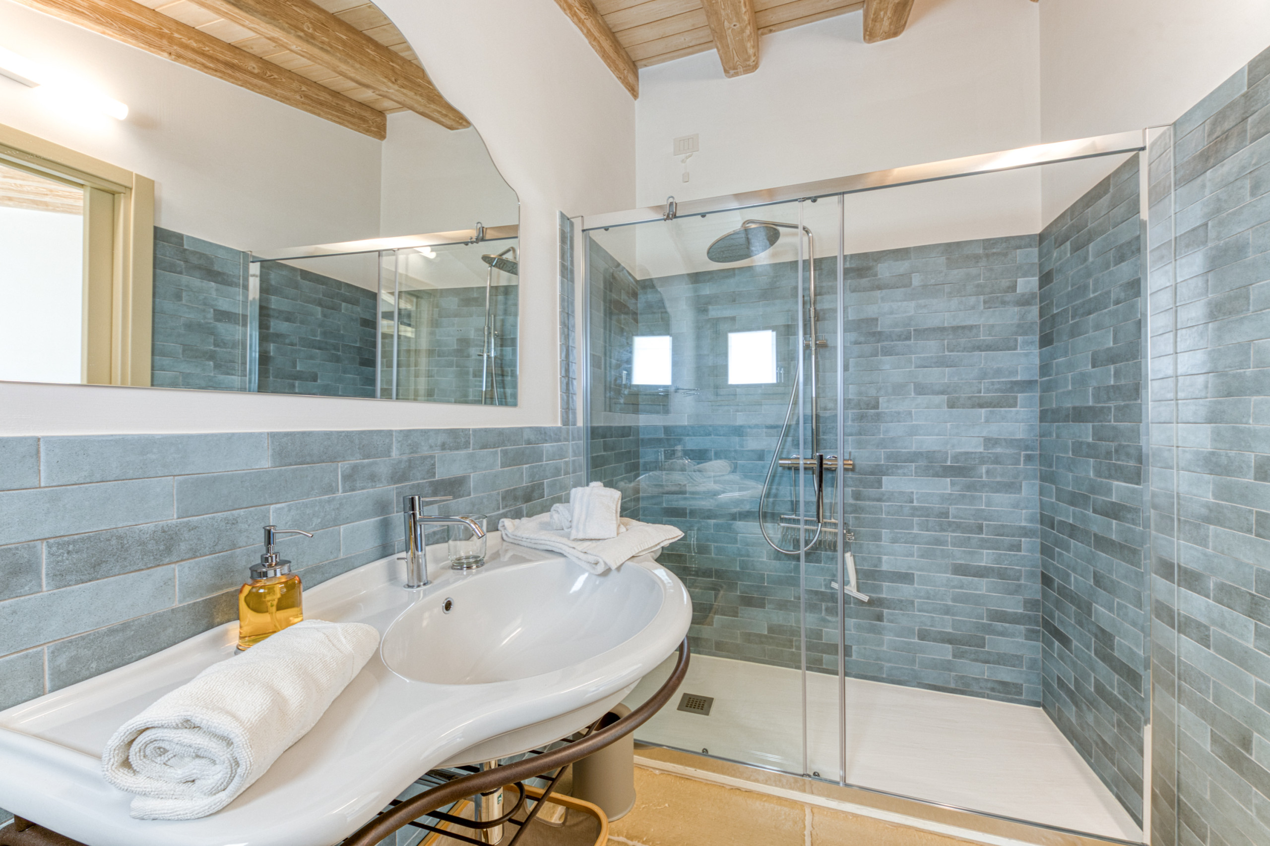 The villa has three double bedrooms, each with its own en-suite shower room. In two of the bedrooms, an armchair can be converted into a single bed (ideal for children). The sofa bed in the living room provides sleeping space for two additional guests, allowing the villa to accommodate up to 10 people. Please note, however, that the bathrooms are only accessible through the bedrooms.