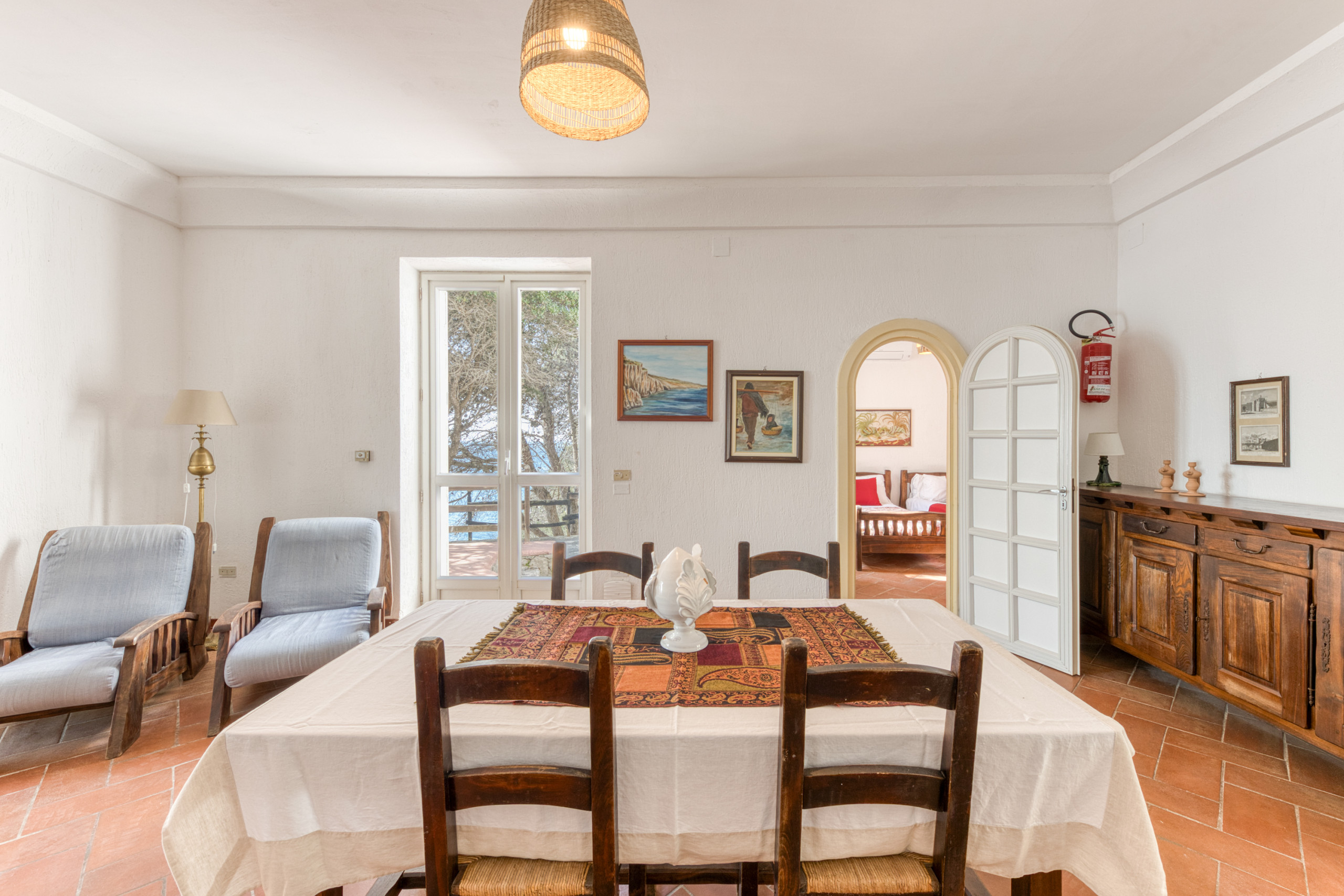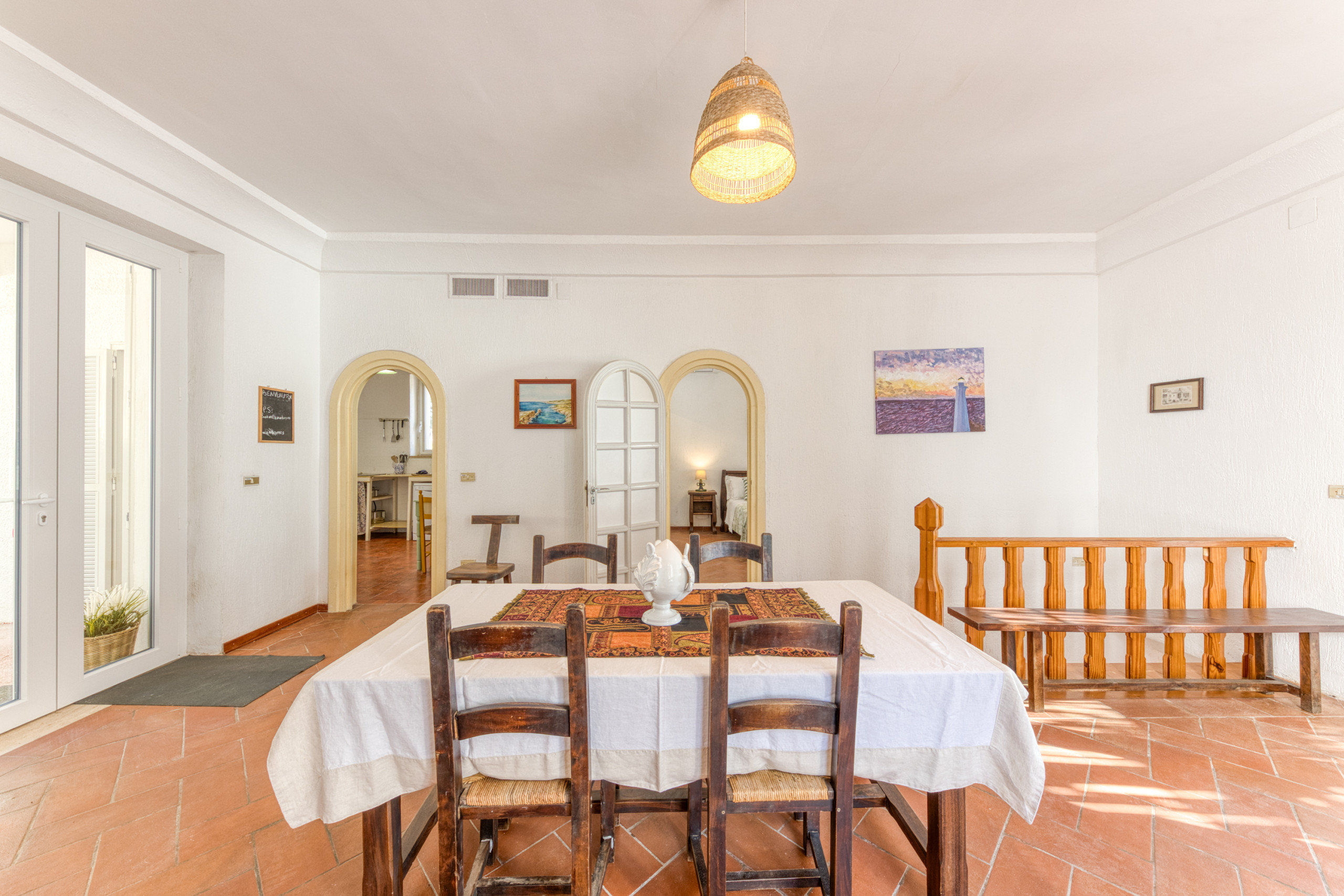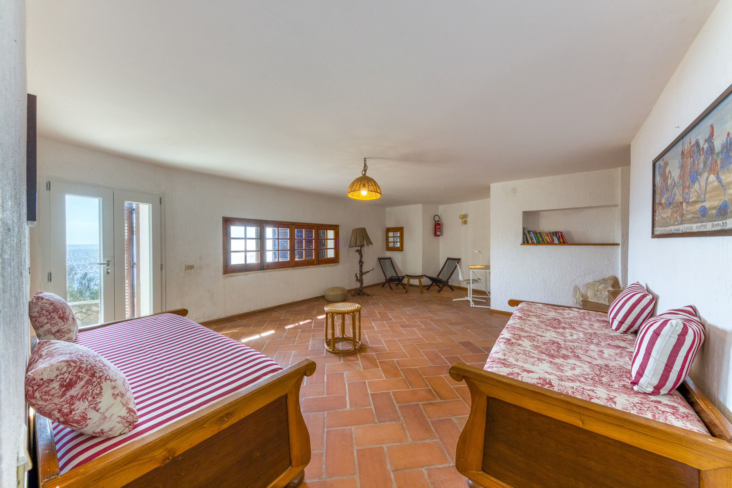 La villa est sur deux niveaux : deux chambres doubles (l'une avec lit double, l'autre avec deux lits simples), chacune avec climatisation et une salle de bain privée, cuisine et un grand salon à l’étage supérieur ; à l’étage inférieur, une chambre double, un autre salon avec deux lits simples et une salle de bain. La décoration intérieure est simple, mais fonctionnelle ; il n’y a pas de télévision, mais le WiFi est gratuit, illimité et de qualité professionelle. Les deux étages ont leurs propres terrasses partiellement ombragées, avec une vue magnifique et un maximum d’intimité.