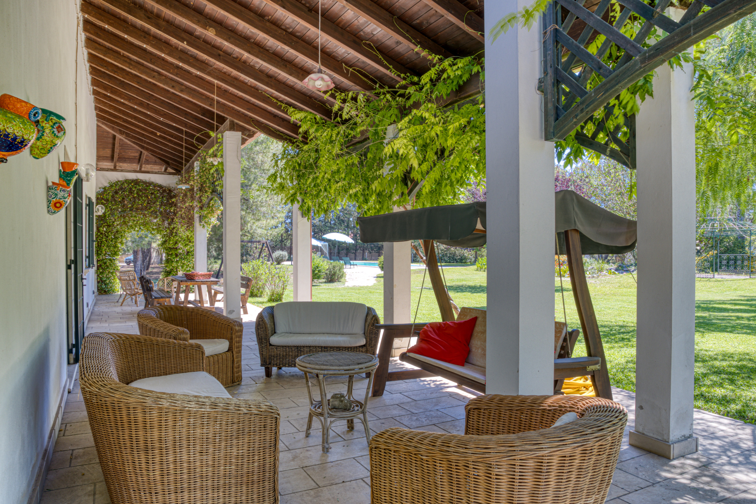 La villa est très spacieuse et dispose d'un grand salon et salle à manger avec des canapés et une table à manger et des chaises, d'une cuisine bien équipée, de deux chambres spacieuses avec chacune leur propre salle de douche, ainsi que d'une salle de douche supplémentaire et d'une buanderie avec machine à laver. La cuisine est équipée d'une cuisinière à gaz, d'un four, d'un lave-vaisselle, d'un réfrigérateur avec congélateur, d'un grille-pain, d'une bouilloire ainsi que d'ustensiles de cuisine et de tout le nécessaire pour cuisiner. Les hauts plafonds voûtés de style local et les meubles en partie anciens confèrent à la maison une touche aristocratique. La maison est climatisée (dans le salon et il y a des ventilateurs supplémentaires dans les chambres), dispose de moustiquaires et est presque entièrement entourée d'une terrasse couverte, en partie recouverte de jasmin grimpant, qui offre une ombre agréable par temps chaud en été.