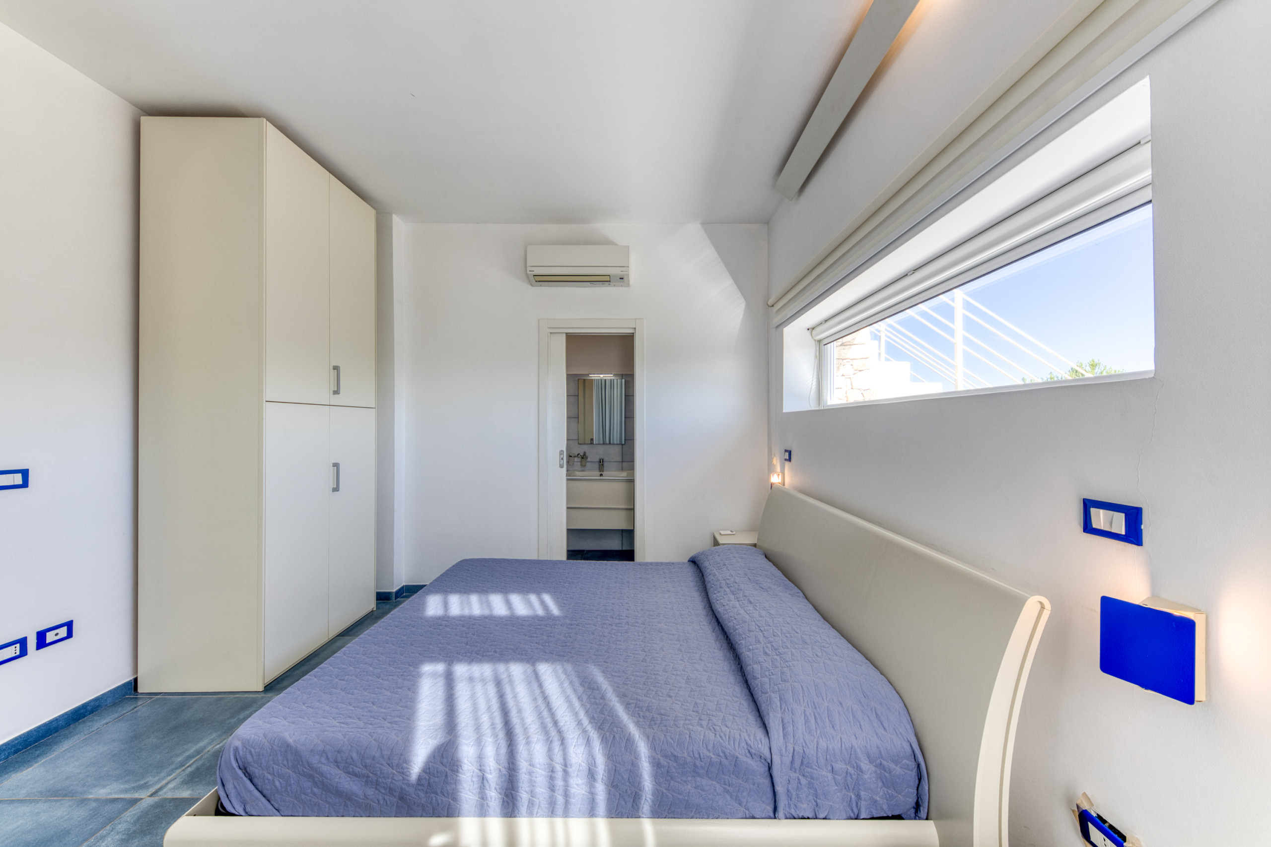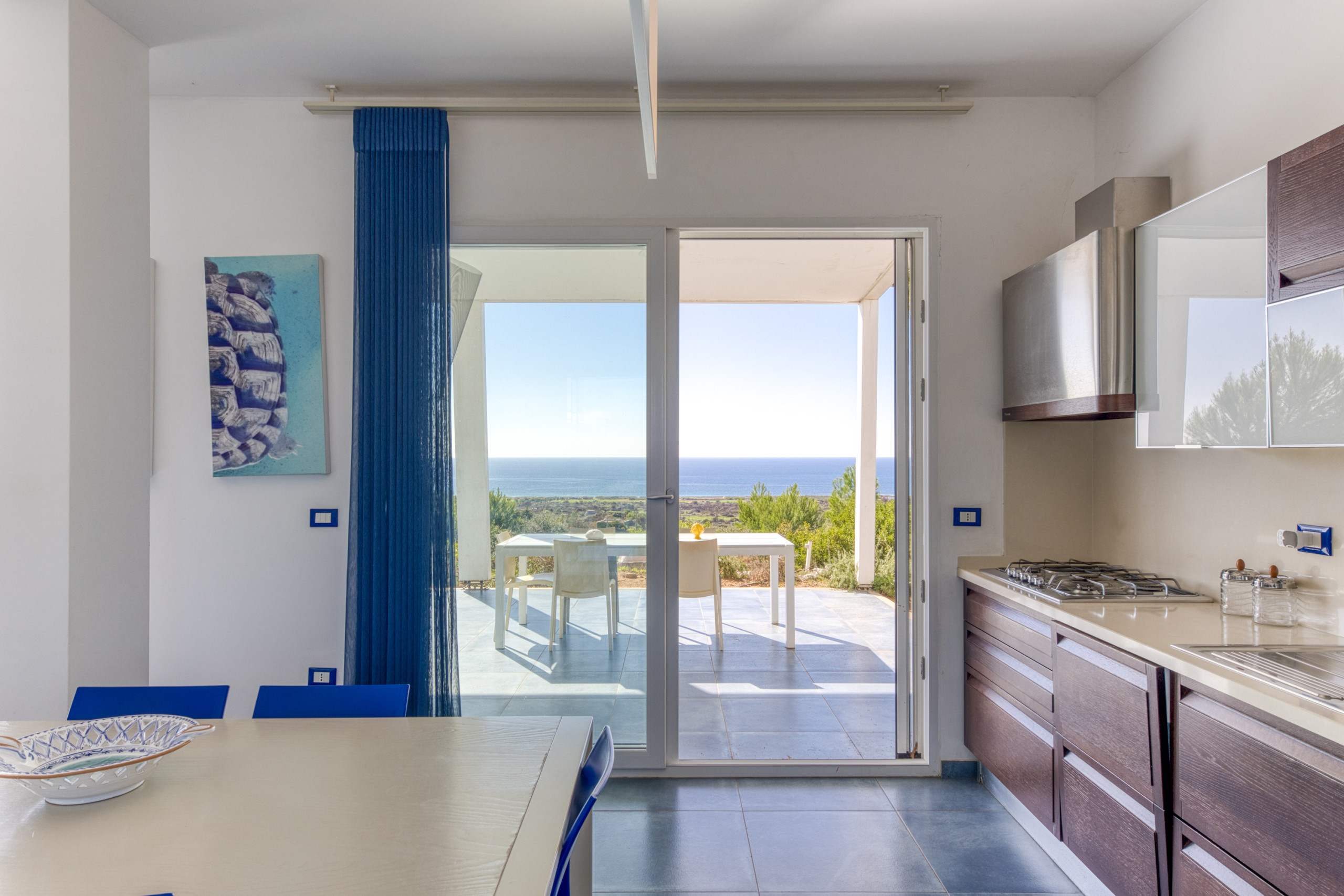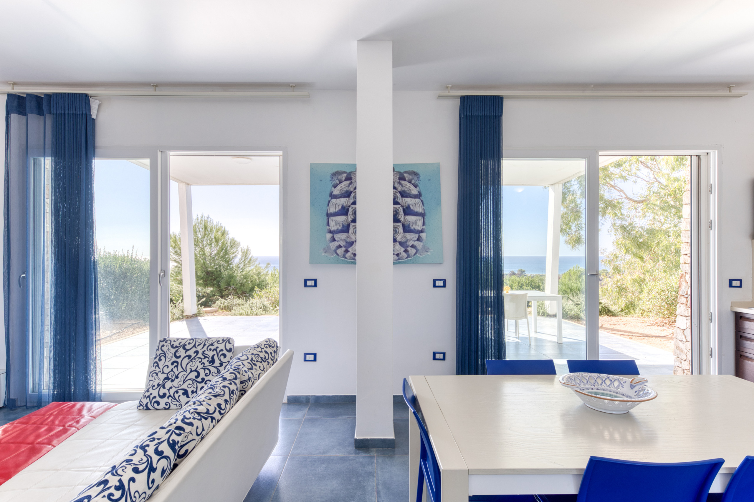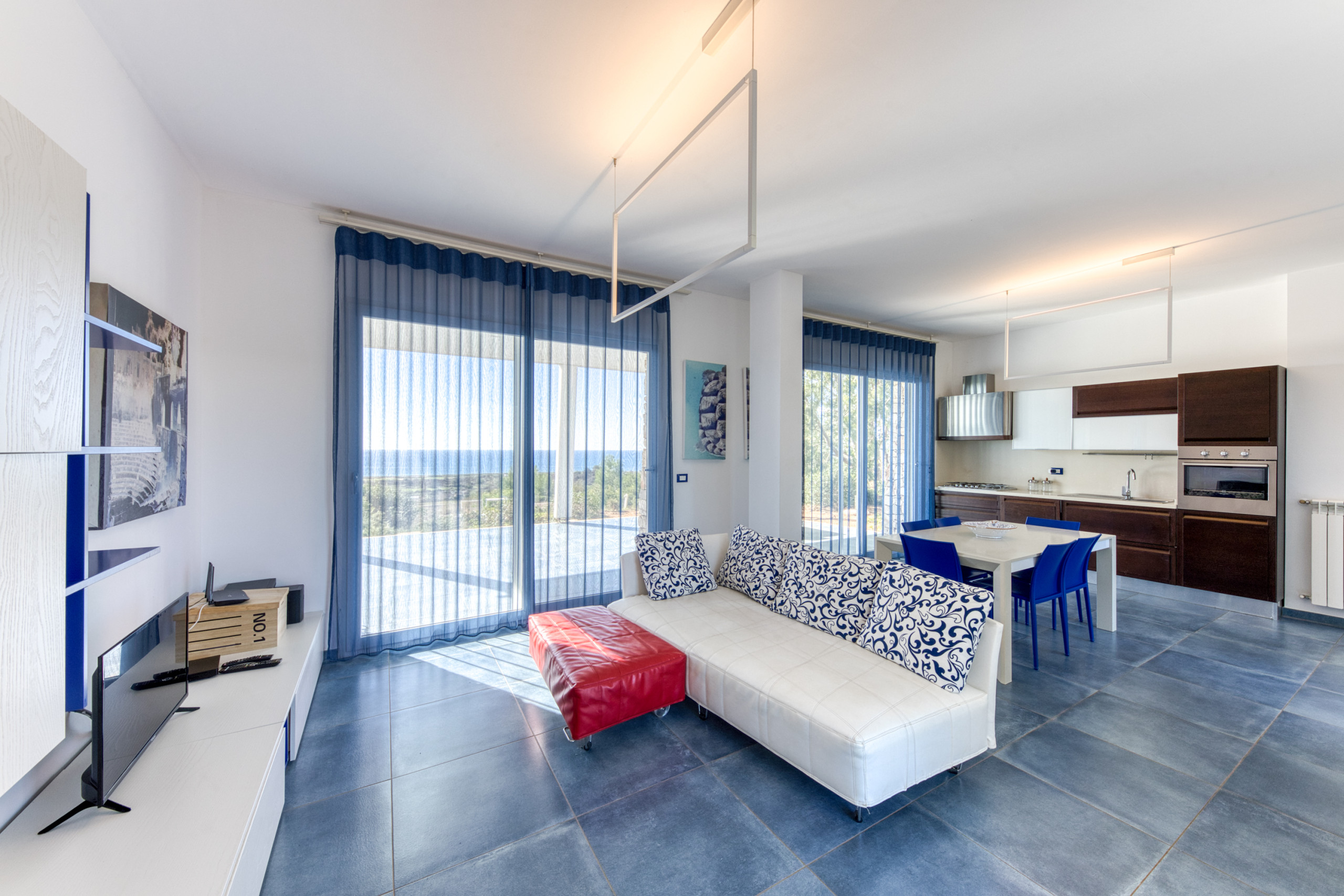 Les intérieurs de la villa sont modernes et entièrement climatisés (froid ou chaud selon la saison). Le grand séjour, ouvert sur la mer avec de grandes baies vitrées, est divisé en un espace séjour avec grand canapé et TV et un espace salle à manger avec cuisine ouverte, table et chaises. La cuisine est équipée d'une cuisinière à gaz, d'un lave-vaisselle, d'un réfrigérateur-congélateur, d'un four, d'un micro-ondes, de vaisselle, de casseroles, d'une cafetière et de tout le nécessaire pour préparer vos repas.
