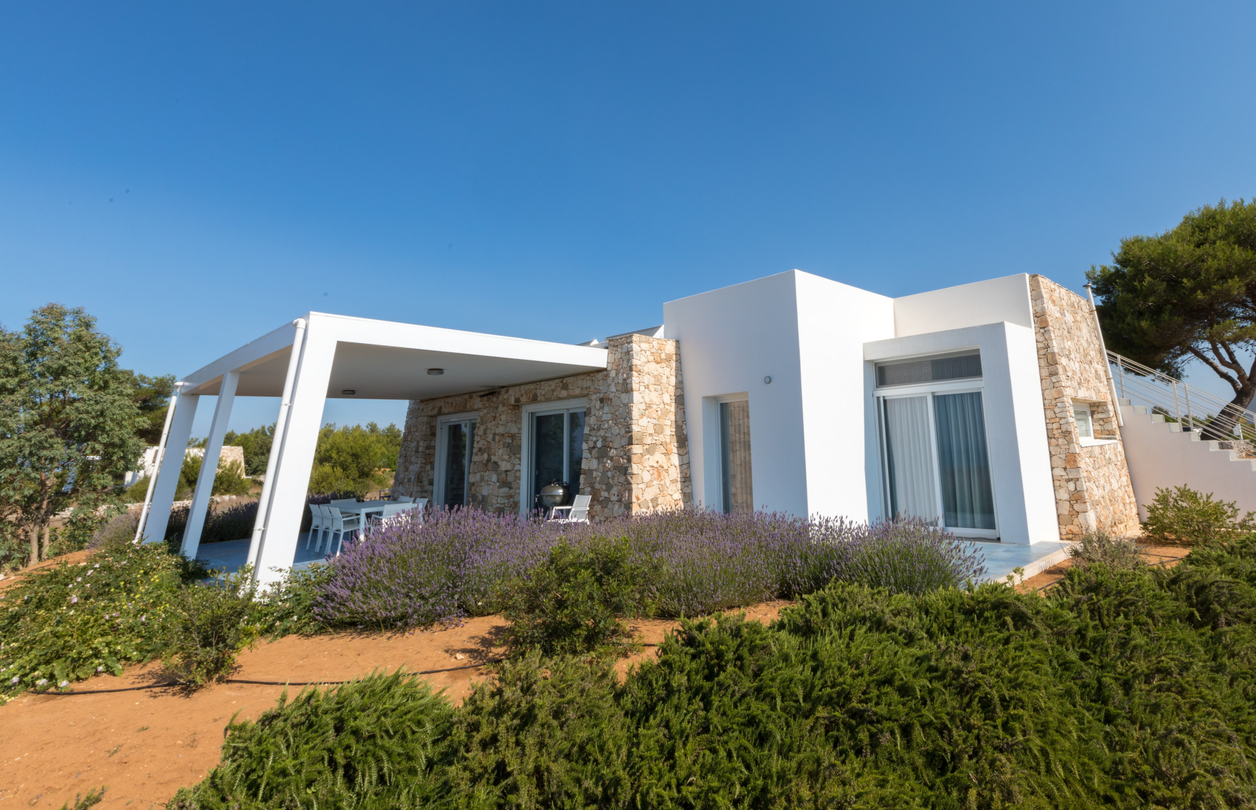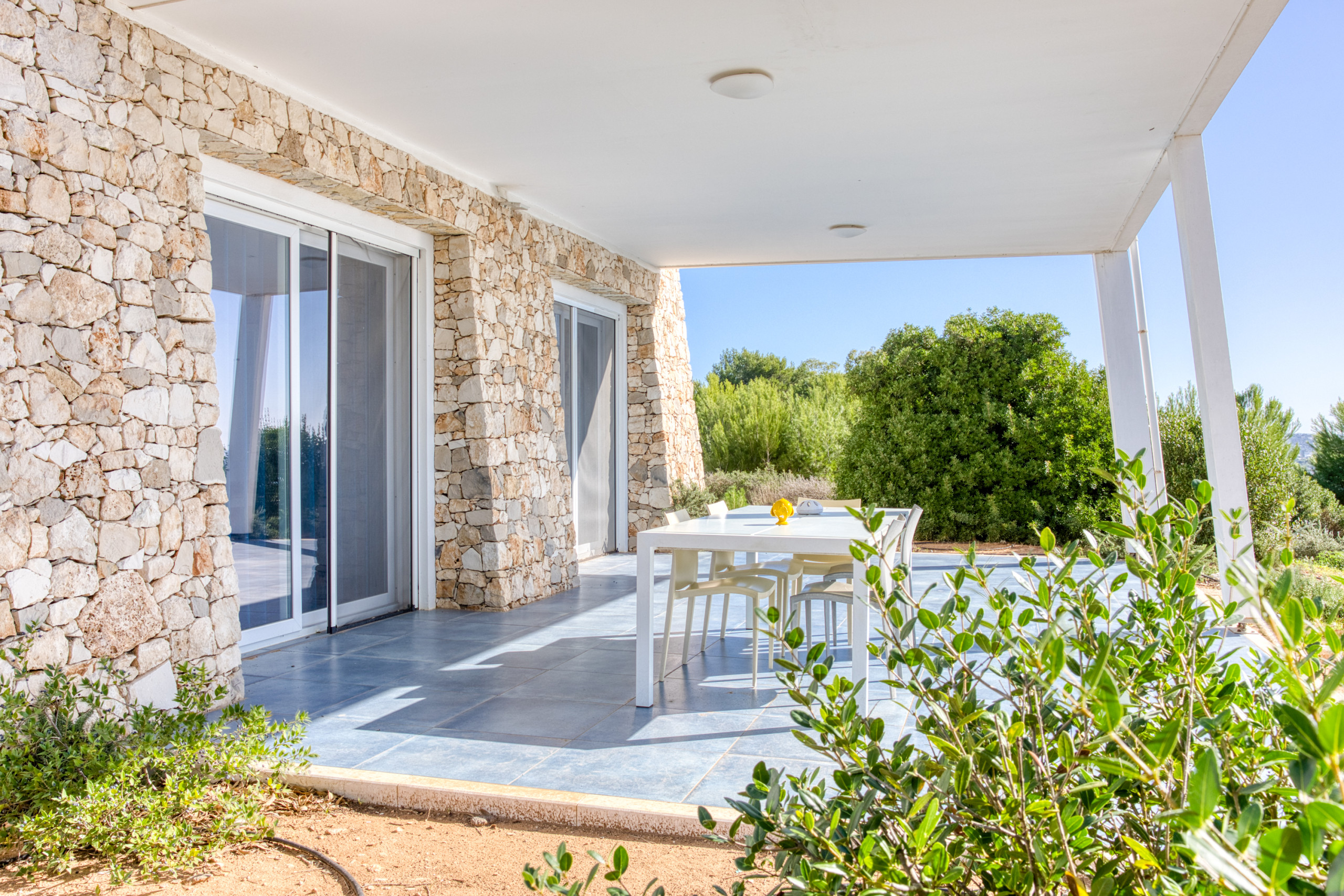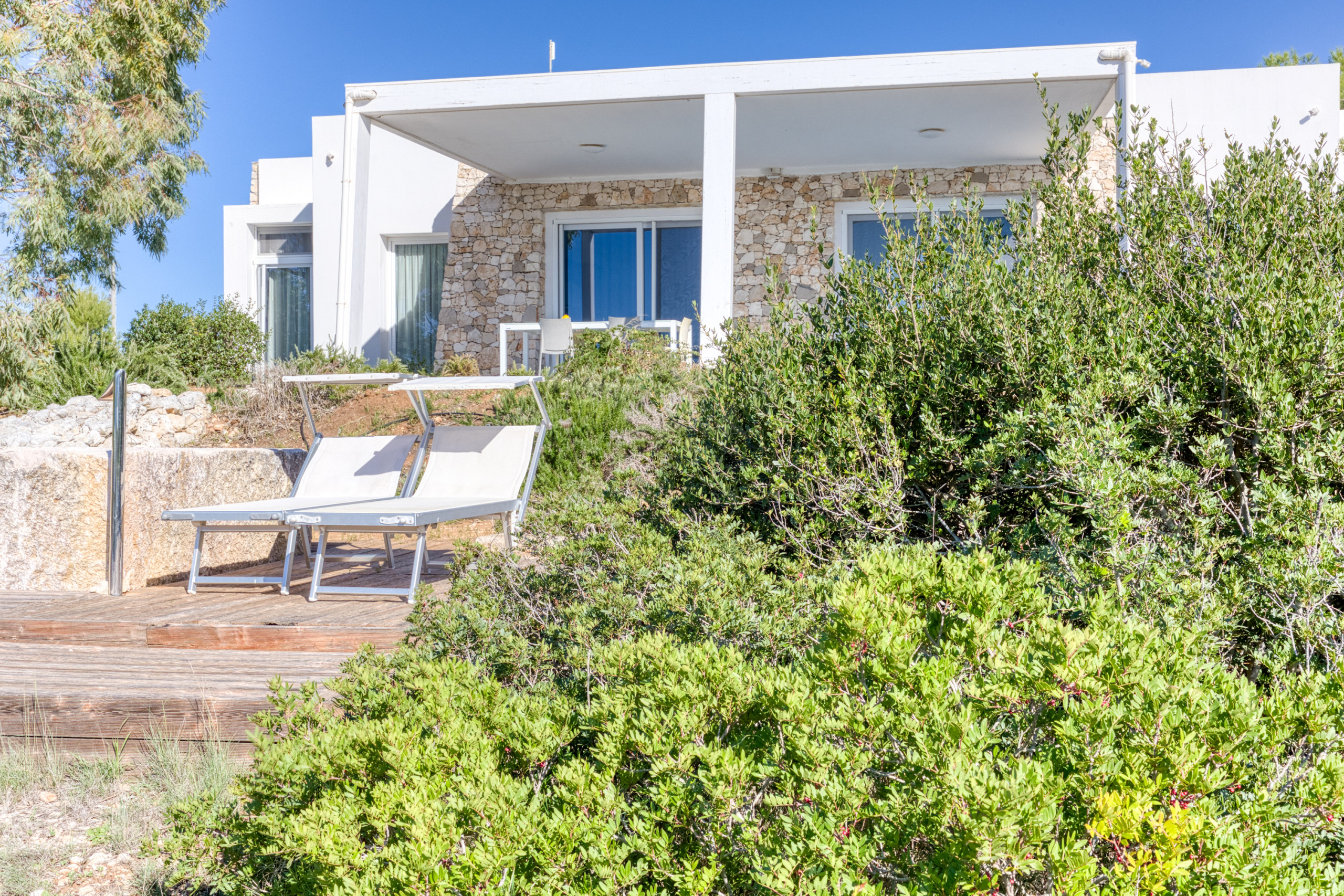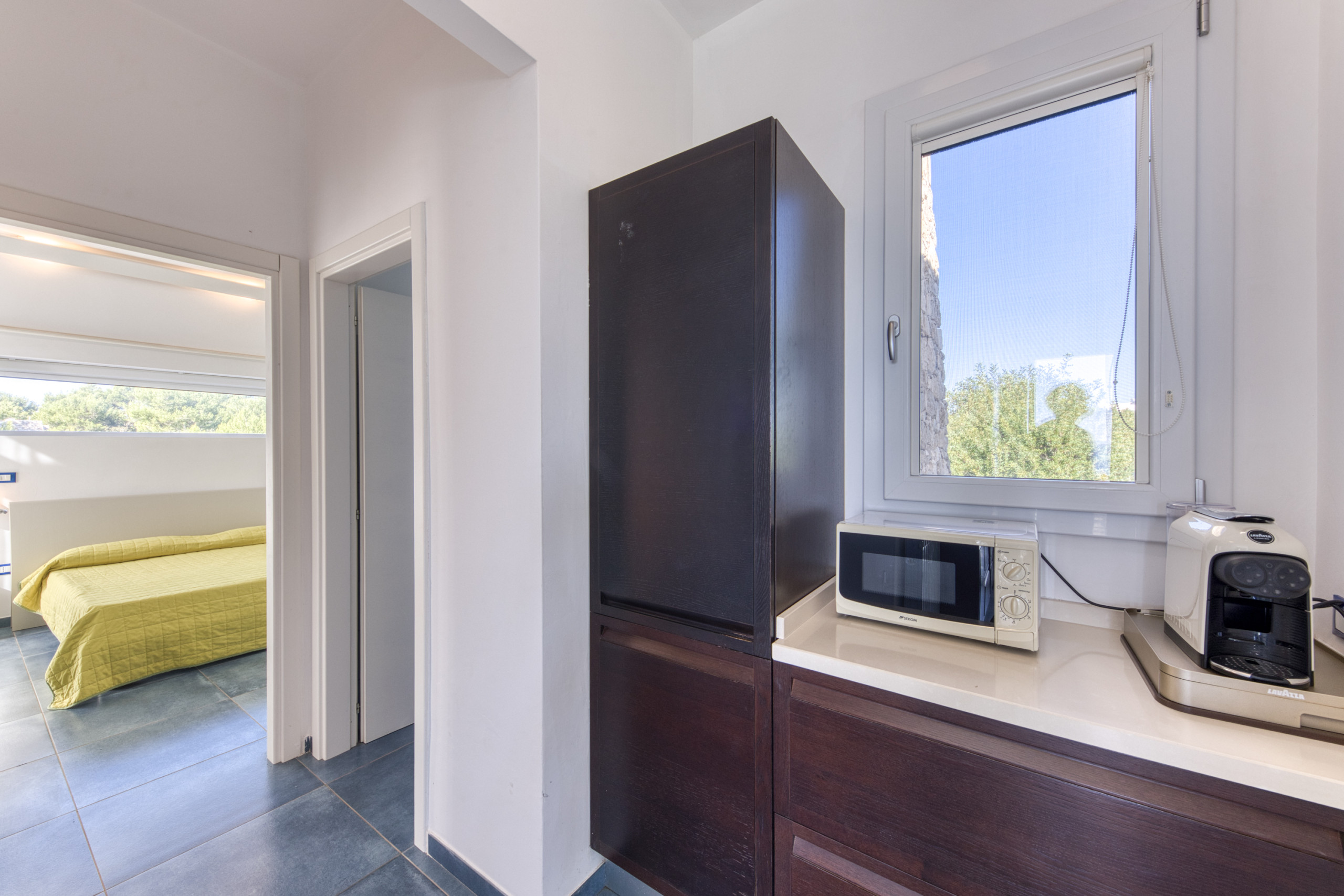Les intérieurs de la villa sont modernes et entièrement climatisés (froid ou chaud selon la saison). Le grand séjour, ouvert sur la mer avec de grandes baies vitrées, est divisé en un espace séjour avec grand canapé et TV et un espace salle à manger avec cuisine ouverte, table et chaises. La cuisine est équipée d'une cuisinière à gaz, d'un lave-vaisselle, d'un réfrigérateur-congélateur, d'un four, d'un micro-ondes, de vaisselle, de casseroles, d'une cafetière et de tout le nécessaire pour préparer vos repas.