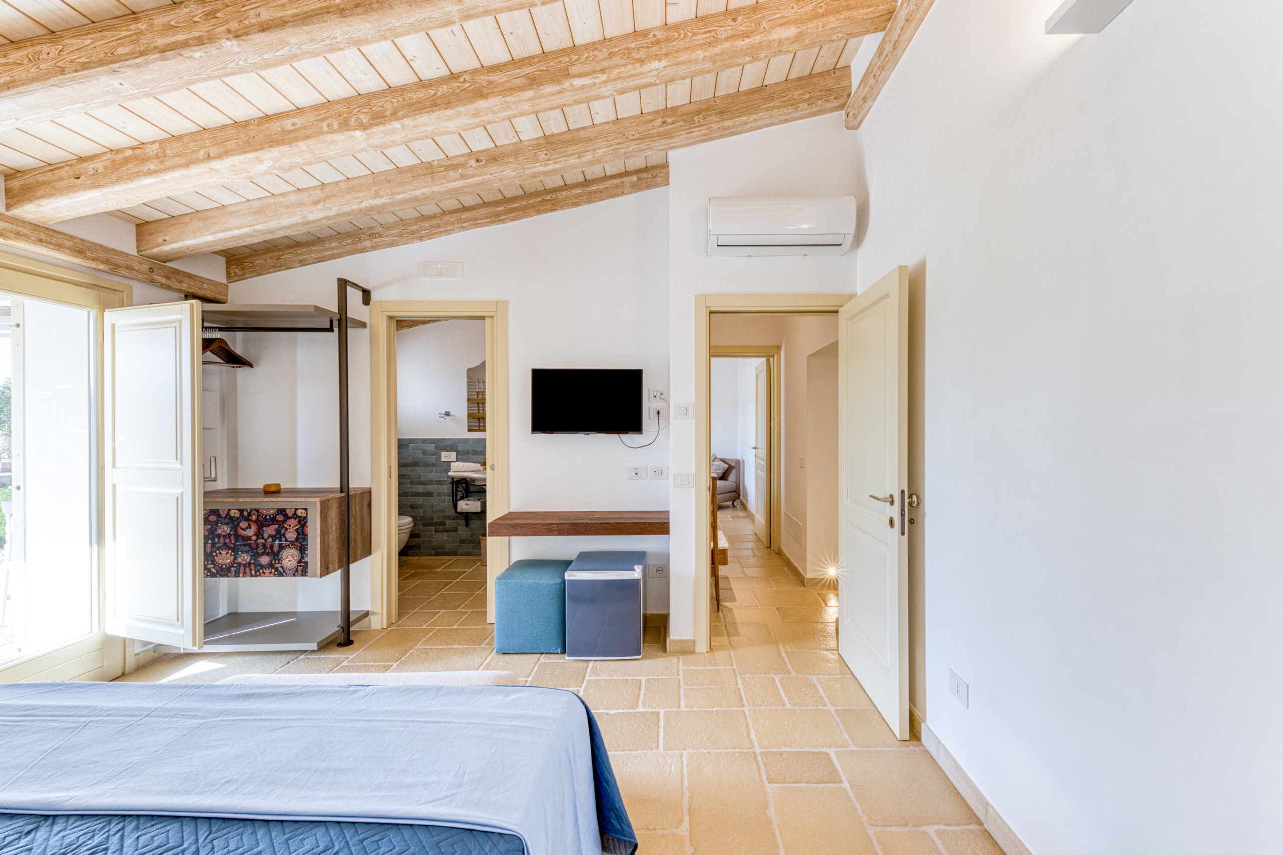 La villa dispose de trois chambres doubles, chacune avec sa propre salle de douche attenante. Dans deux des chambres, un fauteuil peut être transformé en lit simple (idéal pour les enfants). Le canapé-lit du salon offre une place pour deux clients supplémentaires, permettant à la villa d'accueillir jusqu'à 10 personnes. Veuillez noter, cependant, que les salles de bains ne sont accessibles que par les chambres.