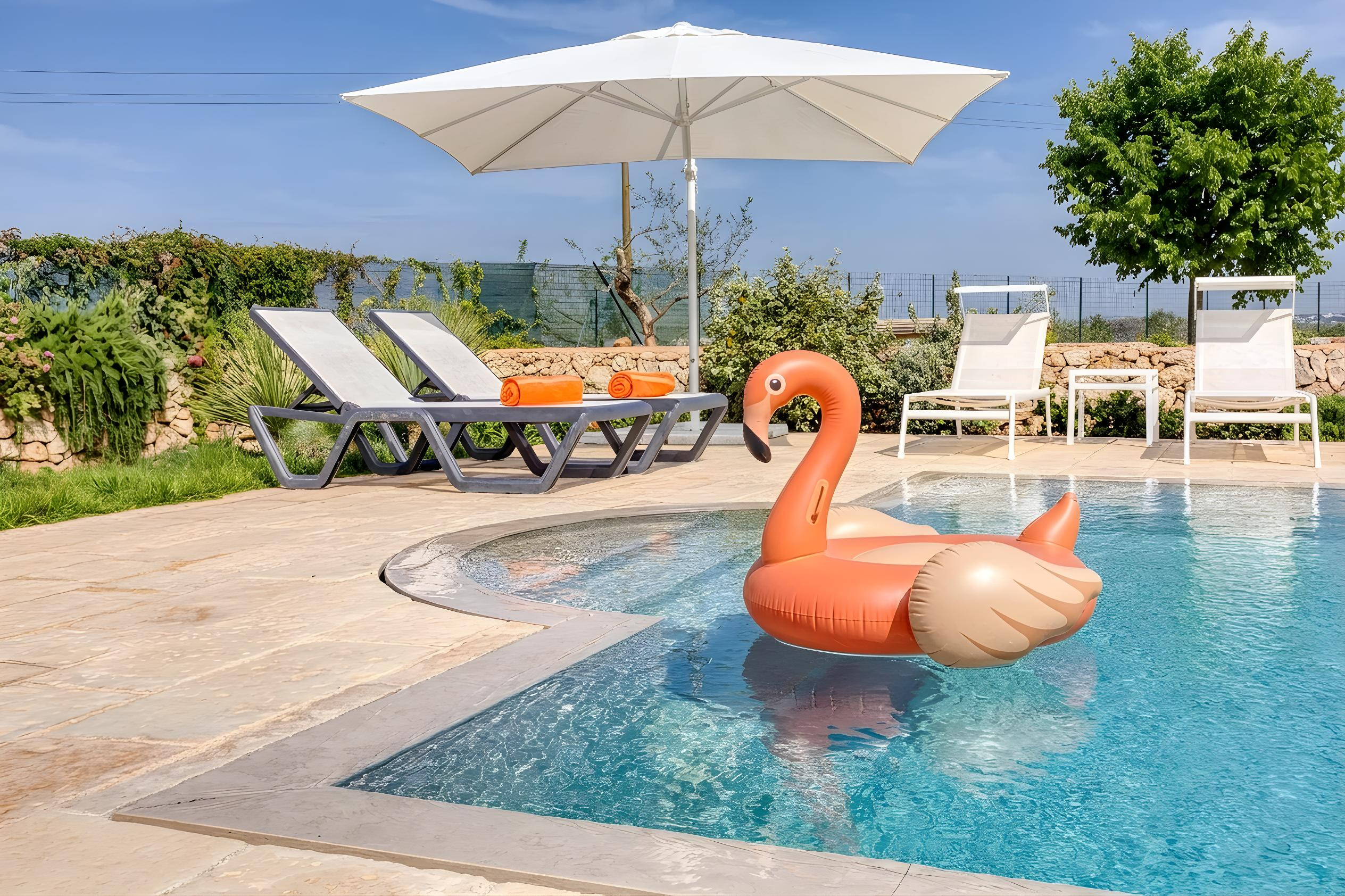 Il y a plusieurs zones extérieures ombragées où vous pouvez vous détendre et profiter de vos repas. Un barbecue, le Wi-Fi et une machine à laver sont fournis. La grande piscine et le jardin sont, bien sûr, exclusivement vôtres. Un carport ombragé (équipé d'un système photovoltaïque) est disponible pour vos véhicules. Il n'y a pas de voisins immédiats, assurant la paix et une intimité maximale.