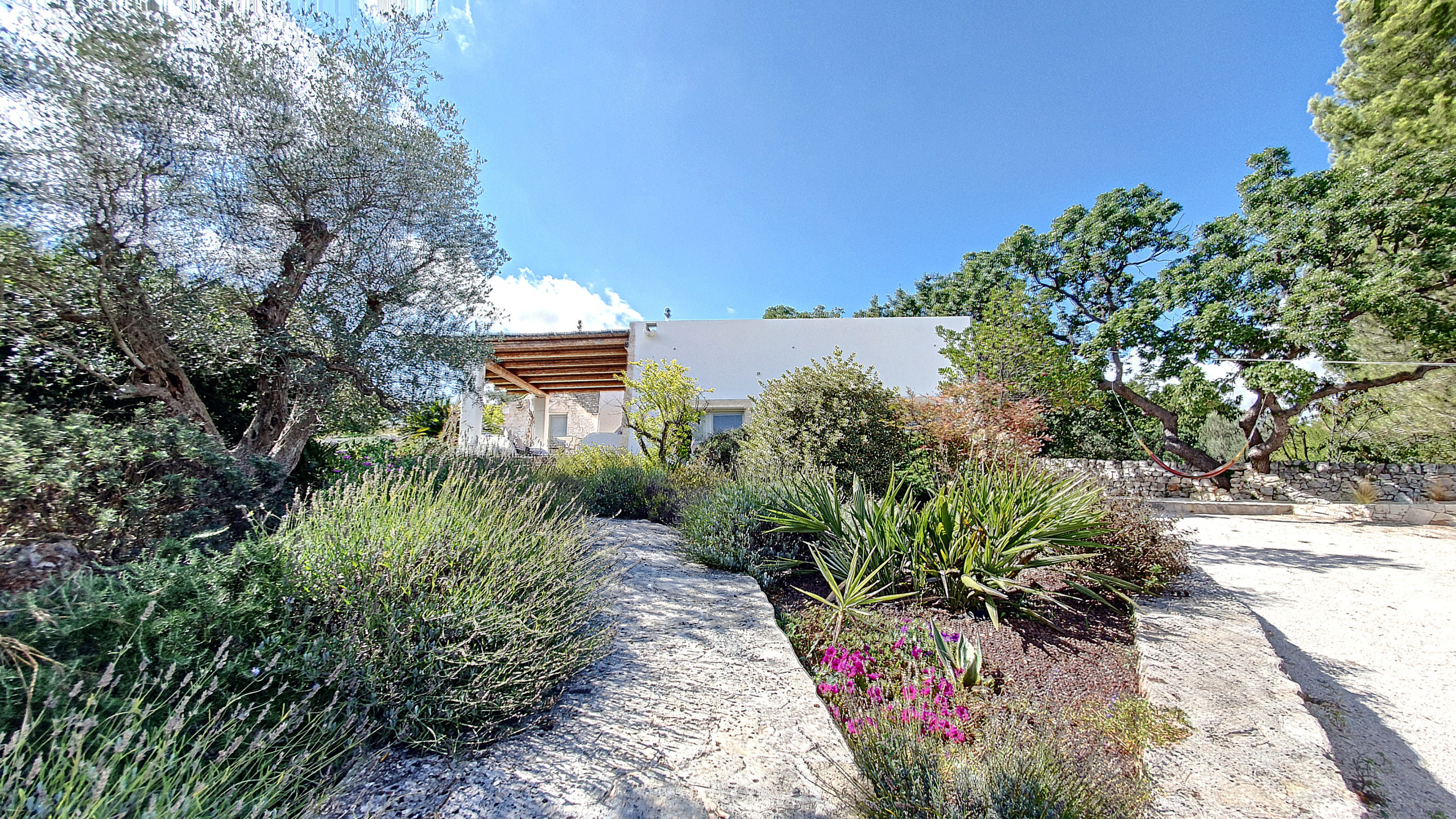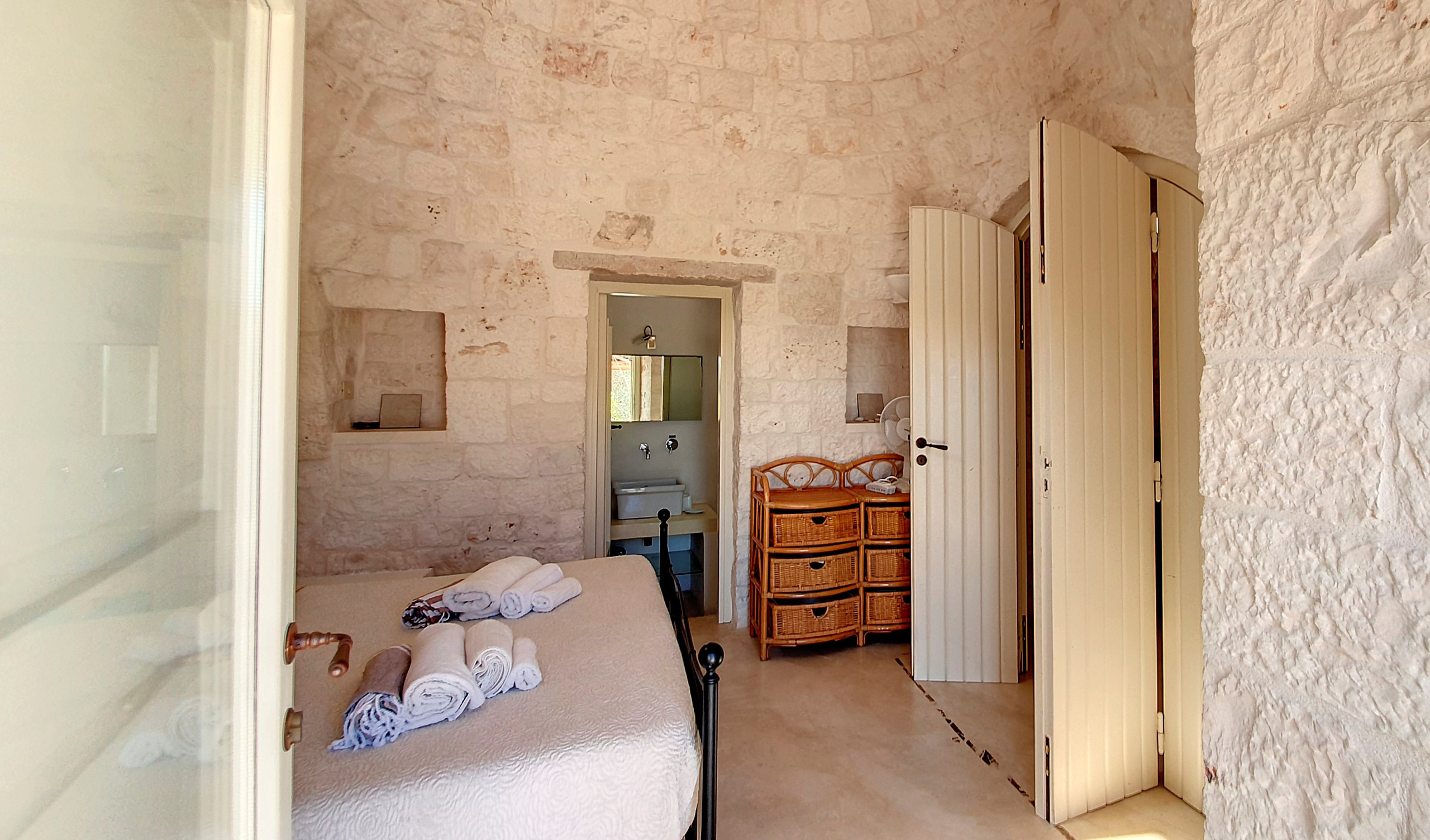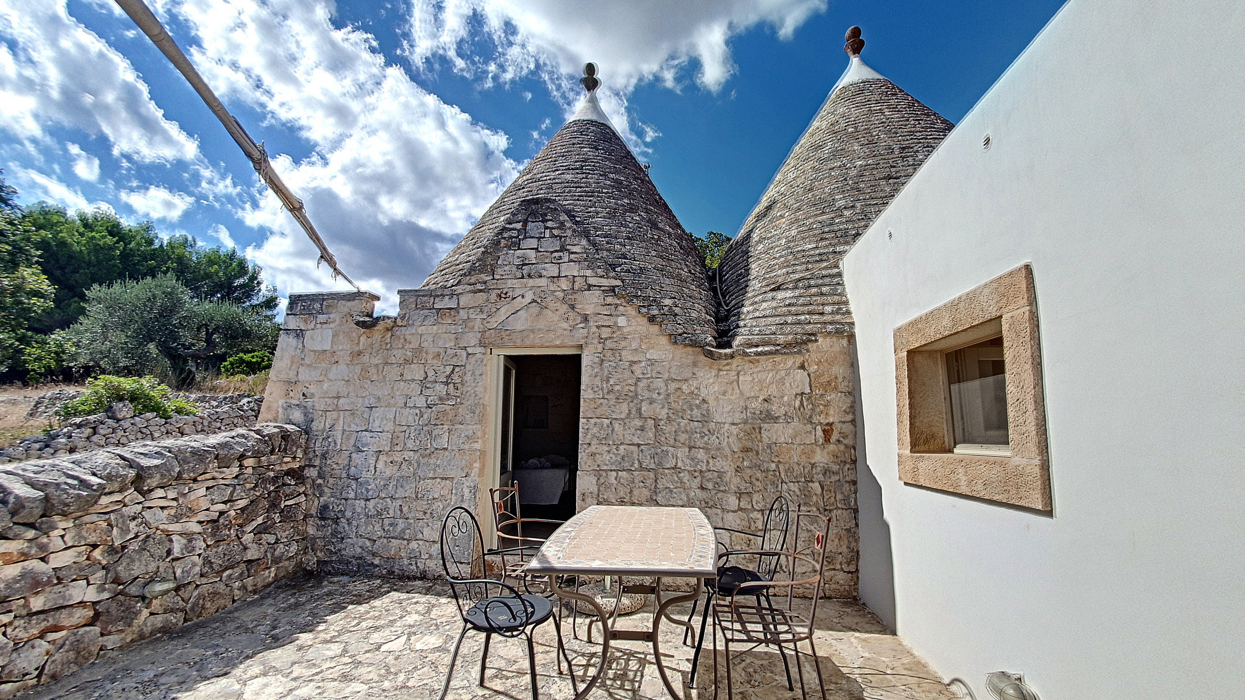 La villa, che integra e amplia, per così dire, i trulli originali presenti nella tenuta, può ospitare fino a un massimo di otto persone. Ci sono tre camere matrimoniali (una con bagno privato), un ulteriore bagno, un soggiorno e sala da pranzo (con un divano letto largo 1,40 m), una cucina ben attrezzata (fornello a gas, lavastoviglie, forno, microonde, tostapane e utensili, stoviglie, posate e pentole) e diverse terrazze con una bellissima vista sul verde e sul paesaggio circostanti. Una grande area barbecue (carbonella o legna) è disponibile e vi invita a trascorrere piacevoli serate barbecue in compagnia. Non c'è l'aria condizionata, ma le originali mura spesse mitigano il calore estivo; forniamo dei ventilatori. Ci sono zanzariere in tutte le camere. Nella stagione fredda la casa è riscaldata.