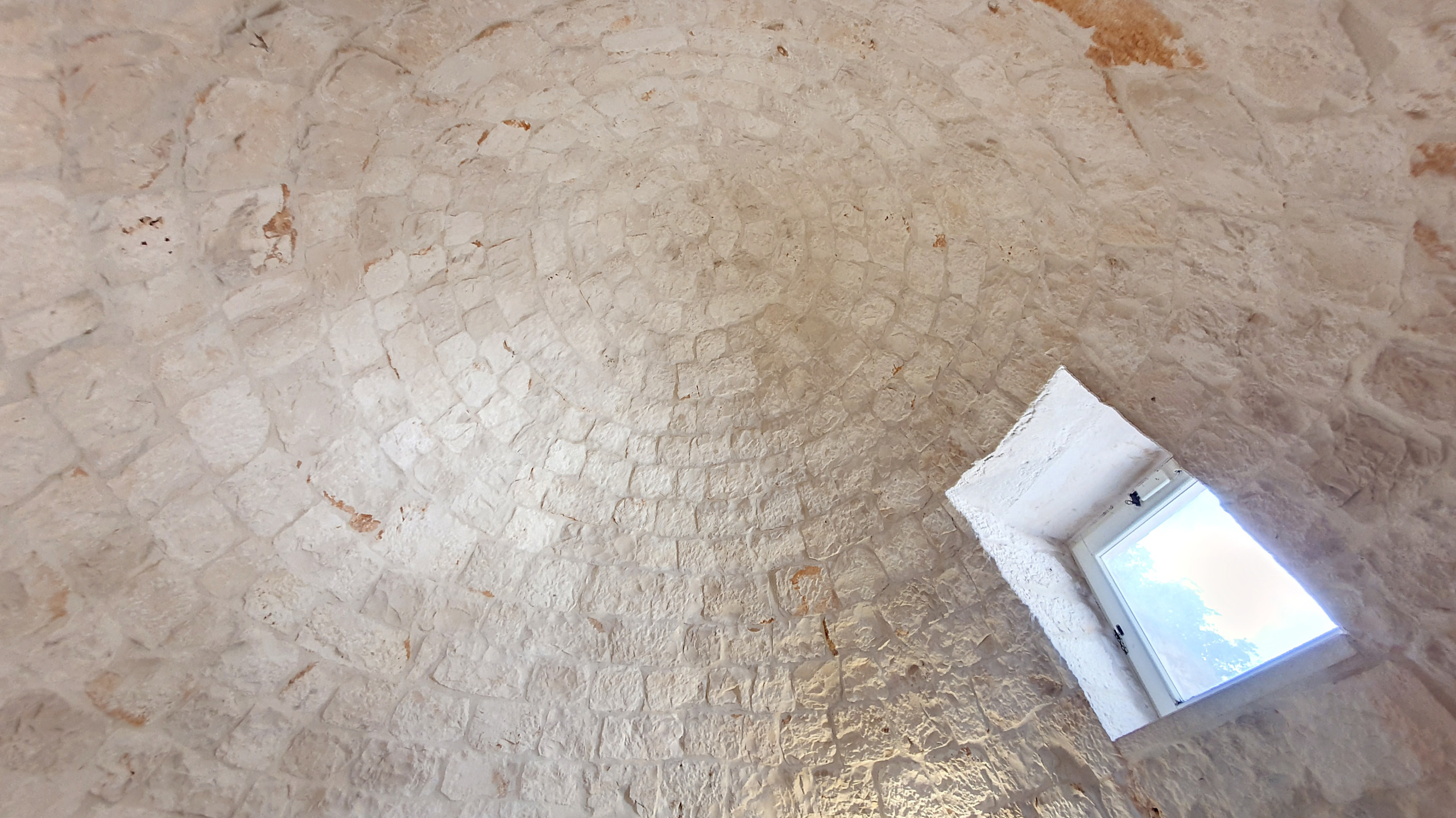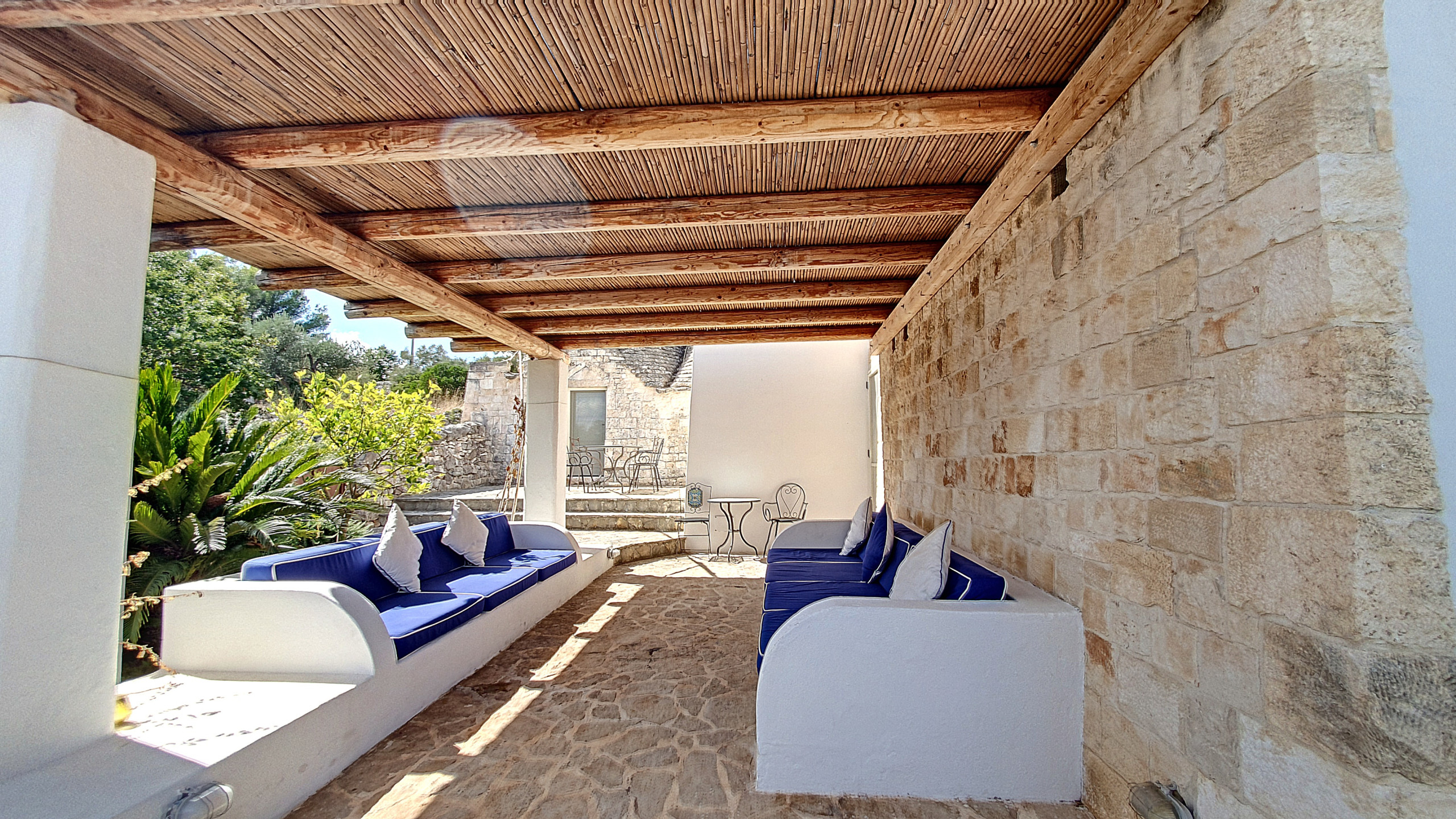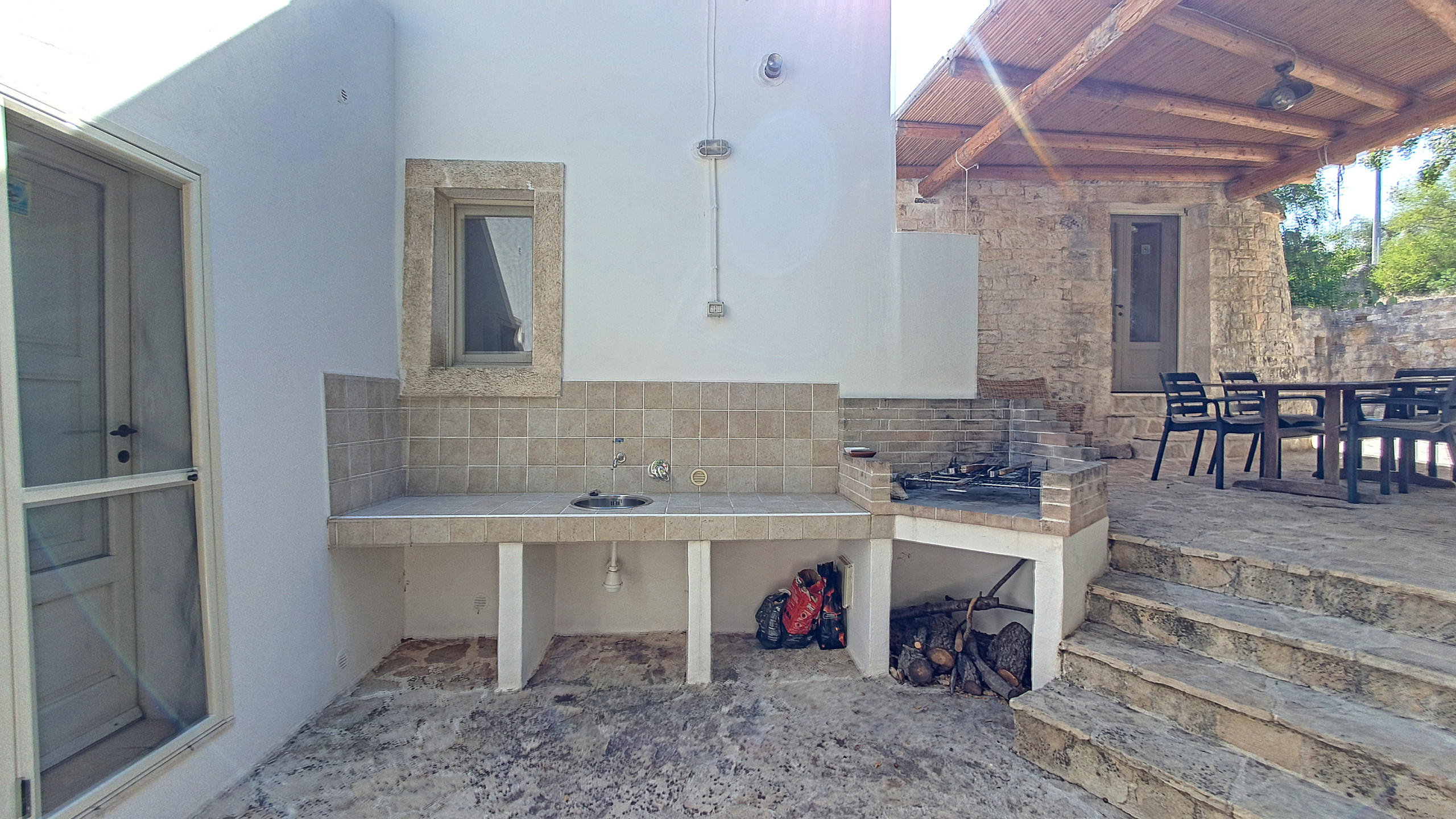 La villa, che integra e amplia, per così dire, i trulli originali presenti nella tenuta, può ospitare fino a un massimo di otto persone. Ci sono tre camere matrimoniali (una con bagno privato), un ulteriore bagno, un soggiorno e sala da pranzo (con un divano letto largo 1,40 m), una cucina ben attrezzata (fornello a gas, lavastoviglie, forno, microonde, tostapane e utensili, stoviglie, posate e pentole) e diverse terrazze con una bellissima vista sul verde e sul paesaggio circostanti. Una grande area barbecue (carbonella o legna) è disponibile e vi invita a trascorrere piacevoli serate barbecue in compagnia. Non c'è l'aria condizionata, ma le originali mura spesse mitigano il calore estivo; forniamo dei ventilatori. Ci sono zanzariere in tutte le camere. Nella stagione fredda la casa è riscaldata.