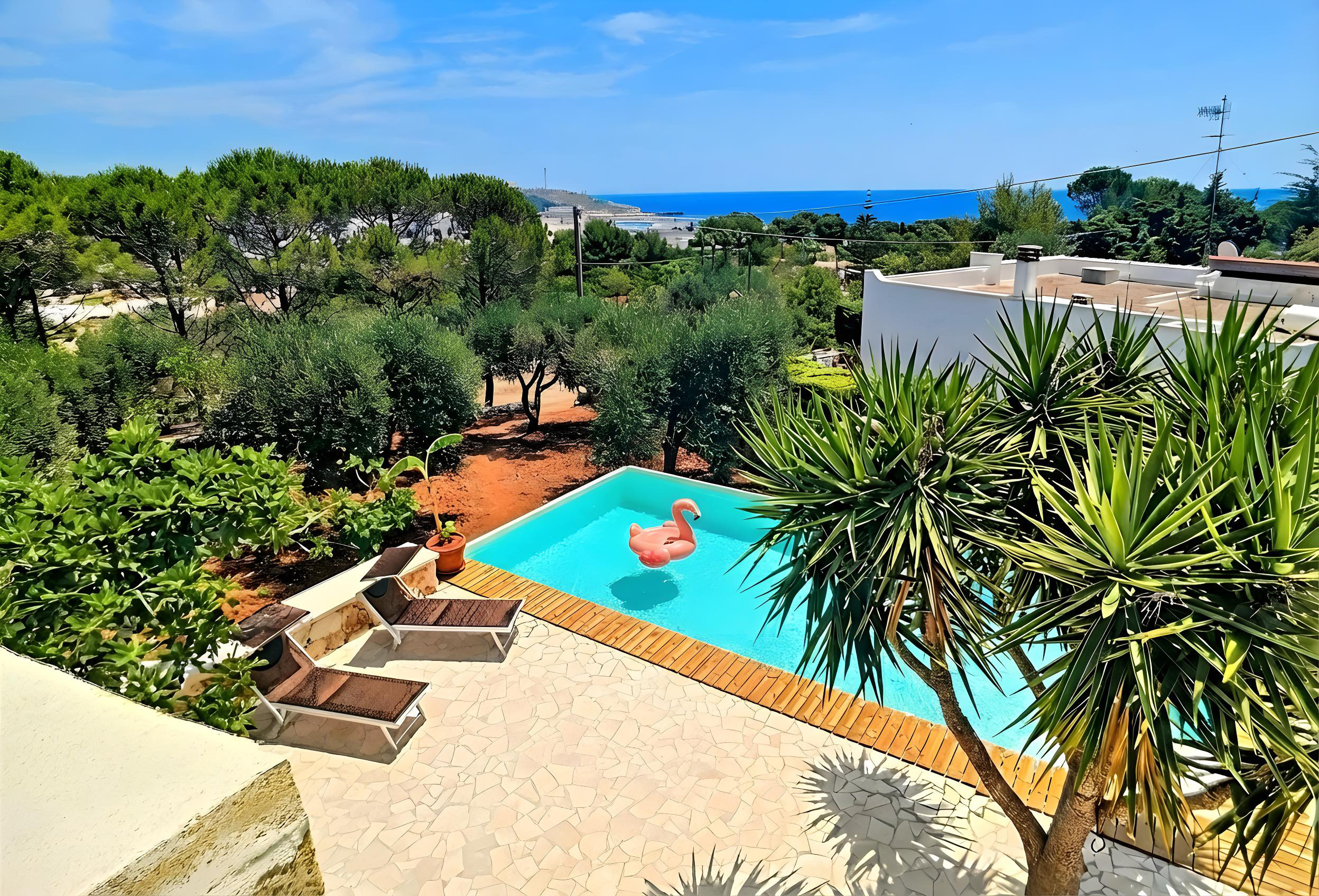Quartier calme, sûre, vue sur mer et sur le phare. Belle piscine, terrasse sur toit, près des oliviers, de la nature. A 15 minutes à pied du centre et de la promenade( lungomare)