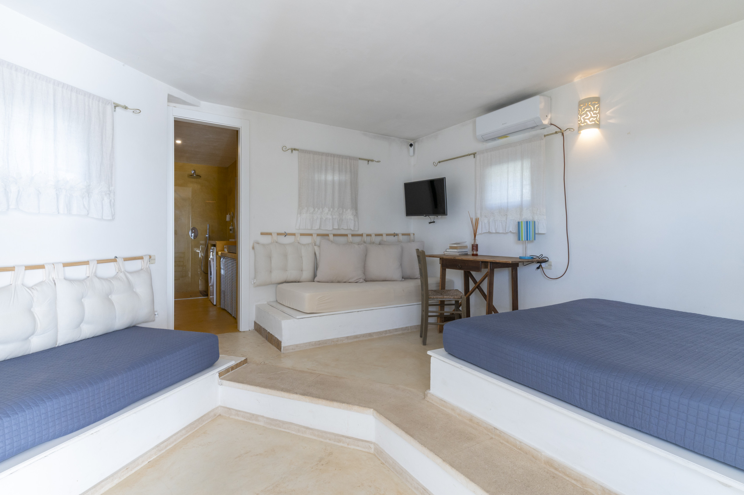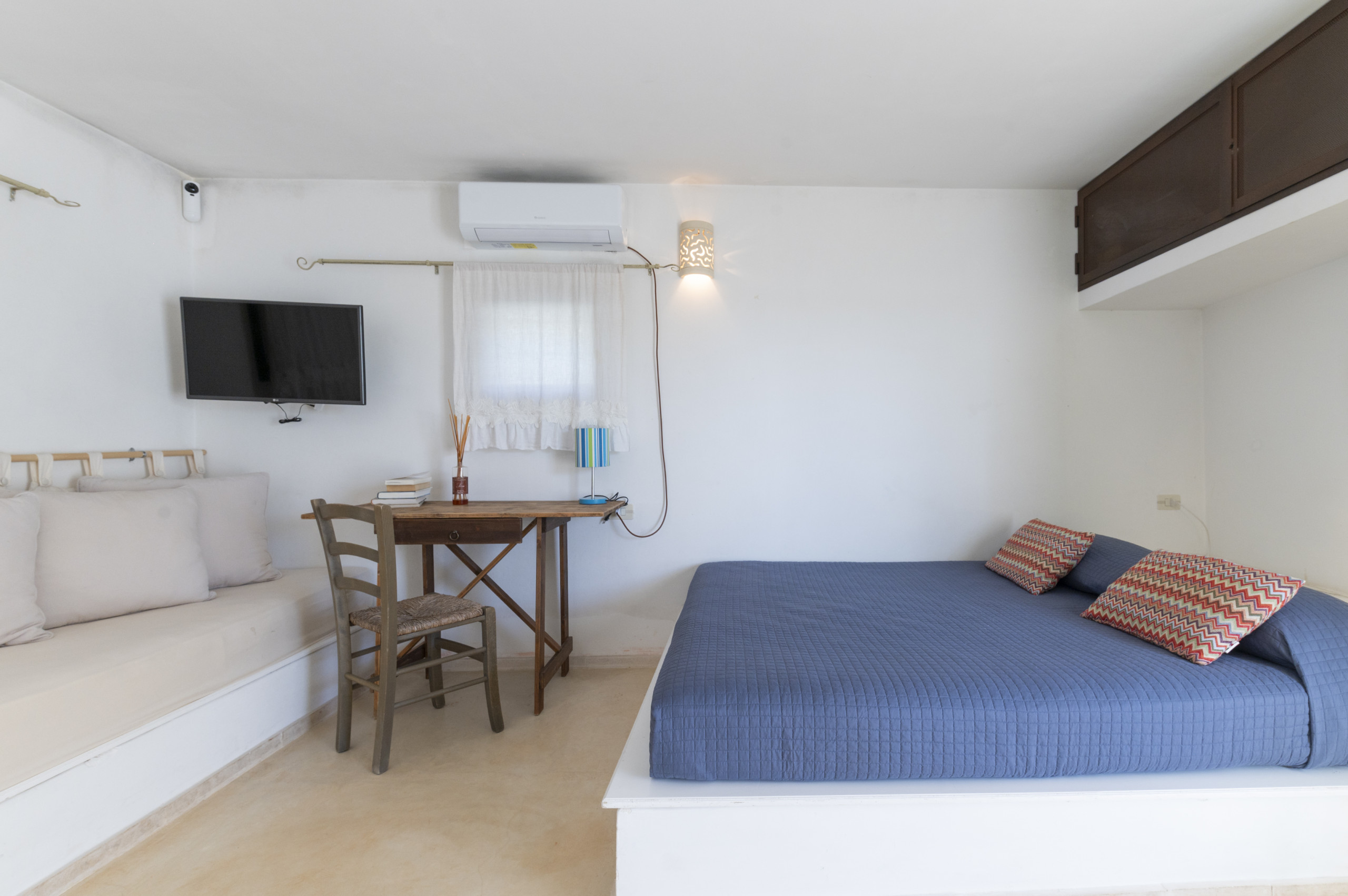 Gli interni sono progettati con cura per il comfort e la funzionalità. La casa dispone di due camere da letto: una più piccola con letto matrimoniale e una più grande, ideale per le famiglie, con un letto matrimoniale e due letti singoli. Ogni camera ha il proprio bagno privato e aria condizionata, garantendo il massimo comfort anche durante i mesi più caldi.